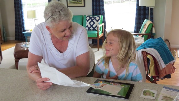 Maren took time out from a game on an iPad to explain to Nana a painting she had done for us.
