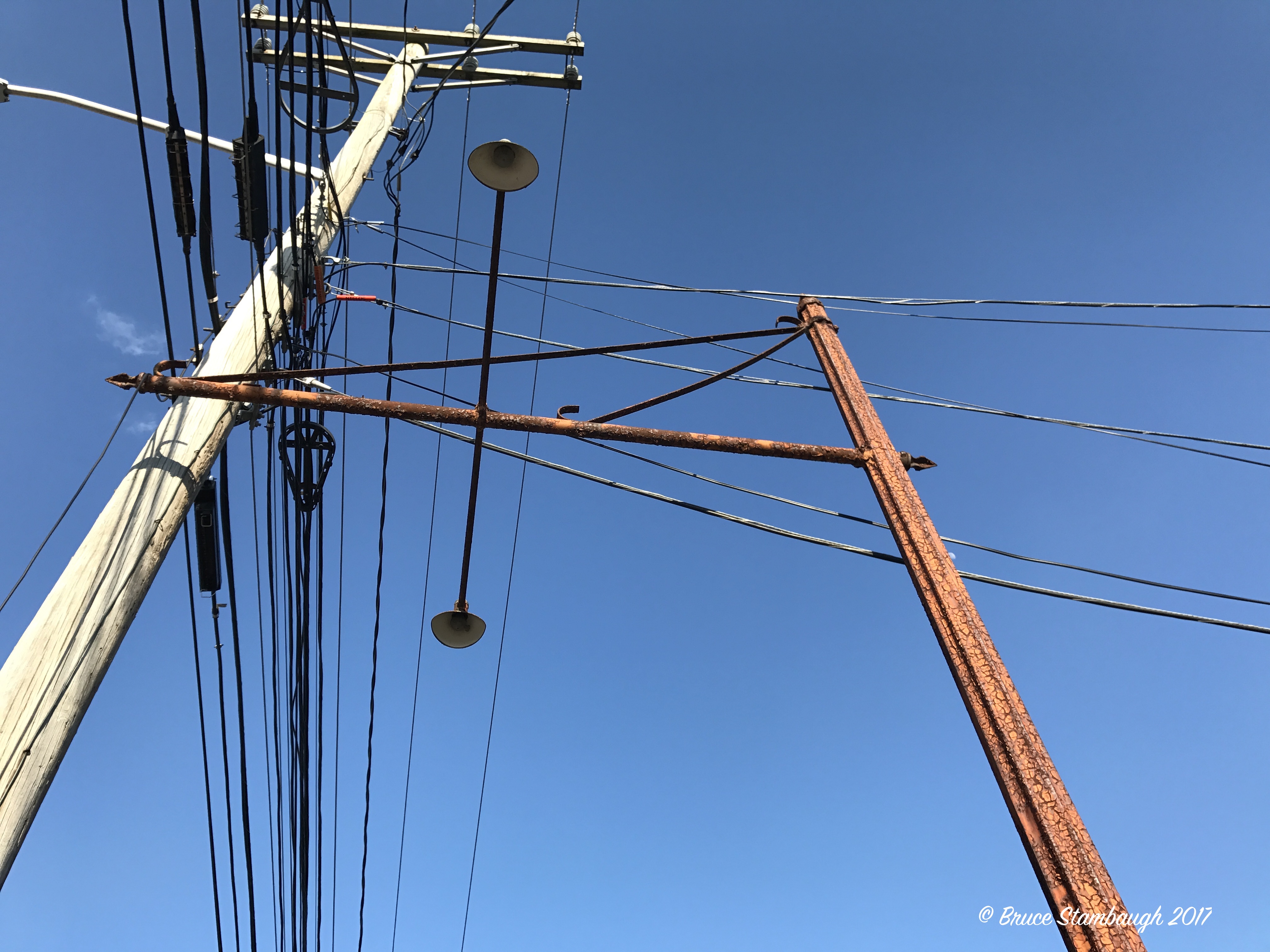 Then I looked up. This pair of display lights stared back at me. I wondered what sign they had once illuminated with their soft, incandescent bulbs blazing away in the night sky. This rusty light pole stood as both a testament to the past and as a work of urban art to the present. In a way, the pole with its twin lights, long dormant, stood in stark contrast to the ugly utility pole and wires that now overshadowed this relic from yesteryear.