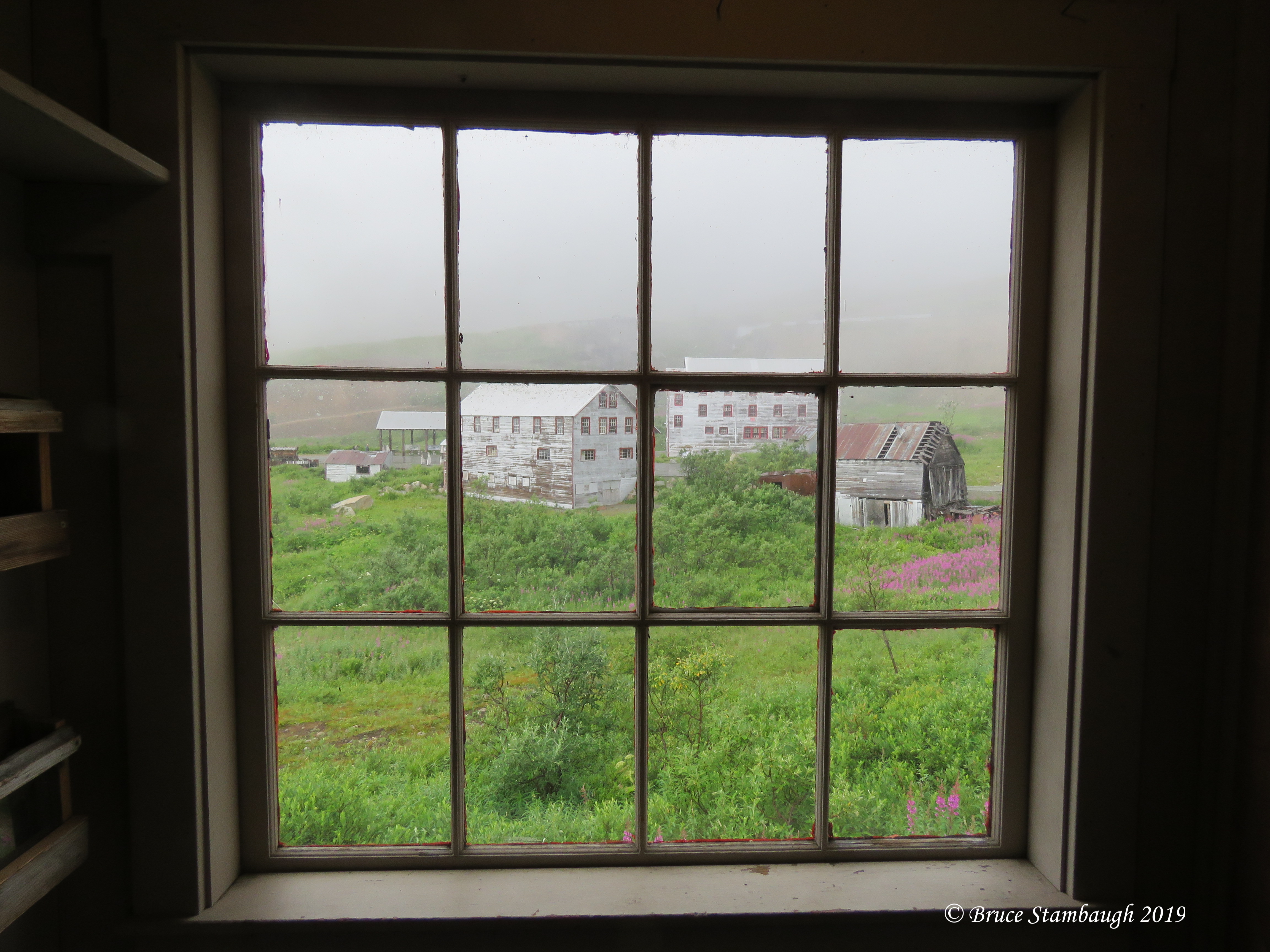 In Anchorage, the weather was warm and sunny. At the old gold mine site high in Hatcher Pass, rain and fog prevailed. As we toured the buildings, I spied this view of the grounds. Taking a photograph through the old bunkhouse window was both symbolic and representative of the past and present. It perfectly framed the scene. The pink fireweed in full bloom added a subtle color that accented the foggy setting.