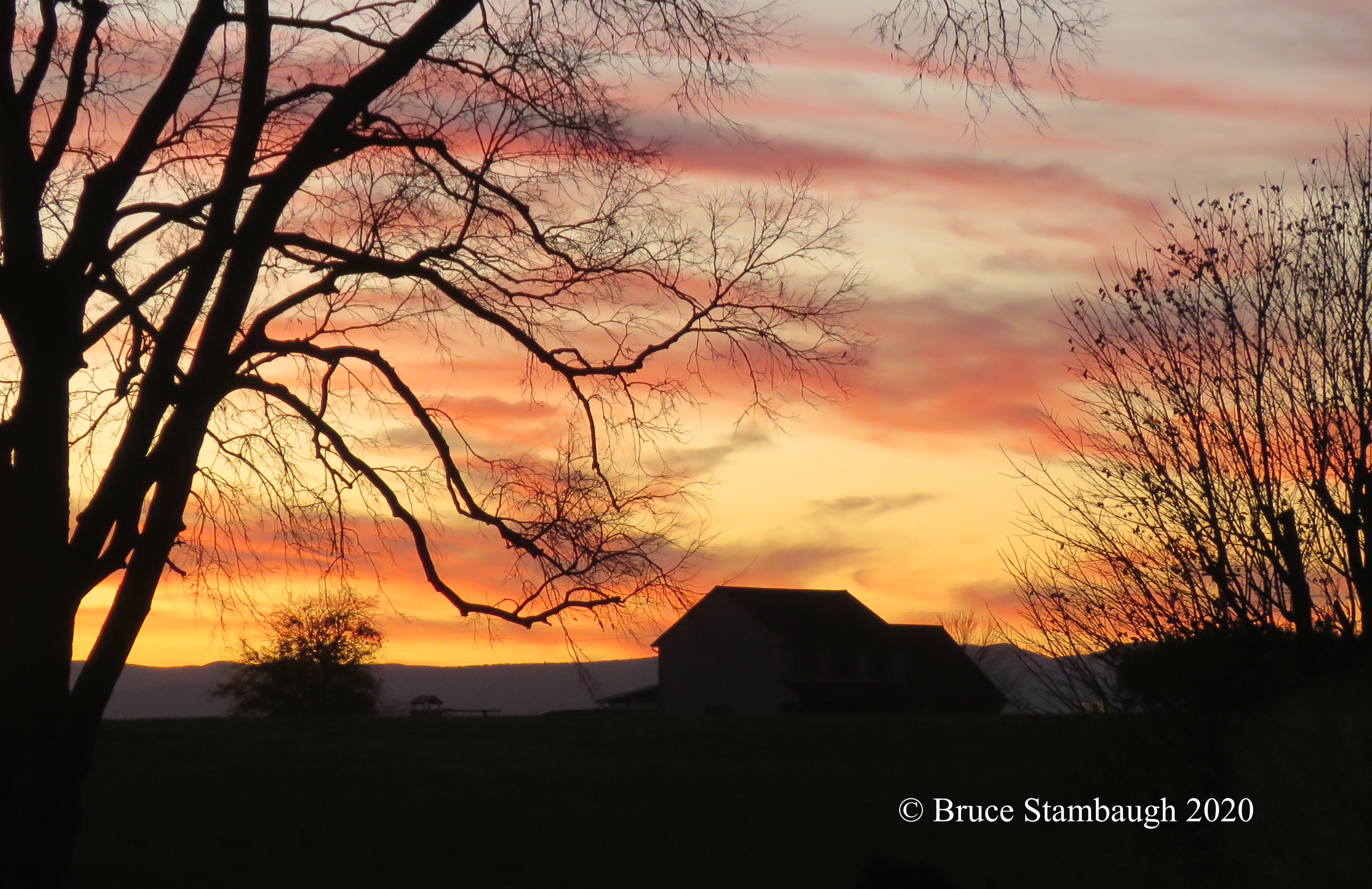 As we sat around the fire pit in the coolness of the early evening, the day’s high, thin clouds hung around long enough to provide a colorful show to the waning day. In the foreground, the silhouettes framed the reddish clouds hanging over the Allegheny Mountains, which mark the boundary between the Commonwealth of Virginia and West Virginia.