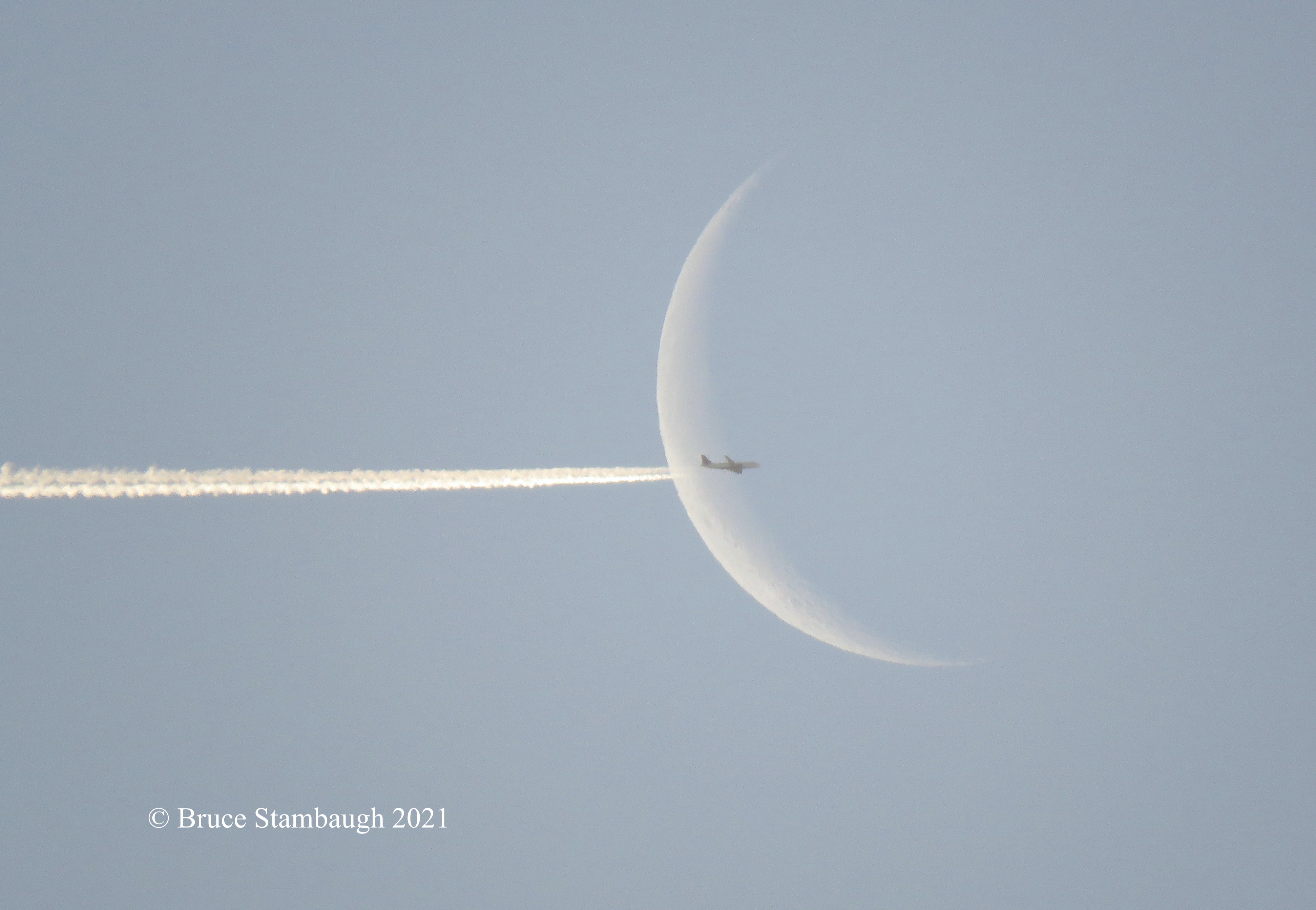 I took the photo and turned to go back inside since it was 15 degrees outside. I happened to notice a jet streaking through the sky to the left of the moon. I braced myself against the frame of our porch door and took this handheld shot just as the jet crossed in front of the moon. Immediately, the lyrics of Count Basie filled my mind. Of course, it was Frank Sinatra’s voice singing this iconic song.