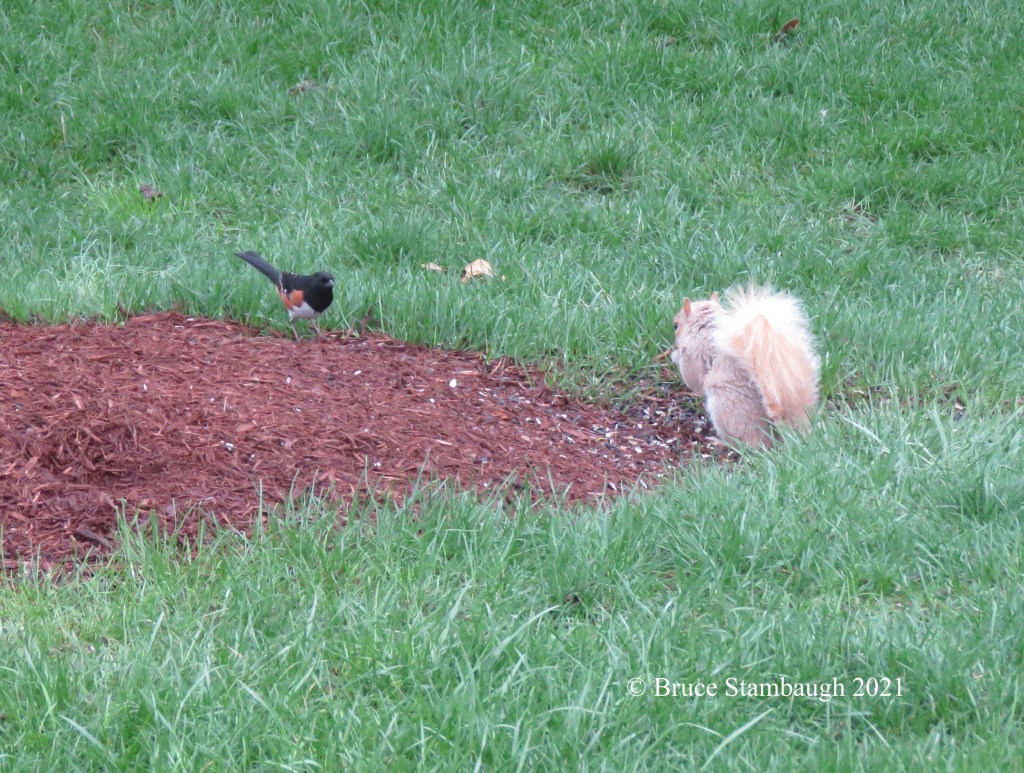 Just being blonde and a squirrel is character enough. When other squirrels approach, Blonde rapidly flips her beautiful golden tail to defend her territory. Satisfied that all is clear, she stretches out on the cool grass in the shadow of the maple, relishing in her most recent victory.