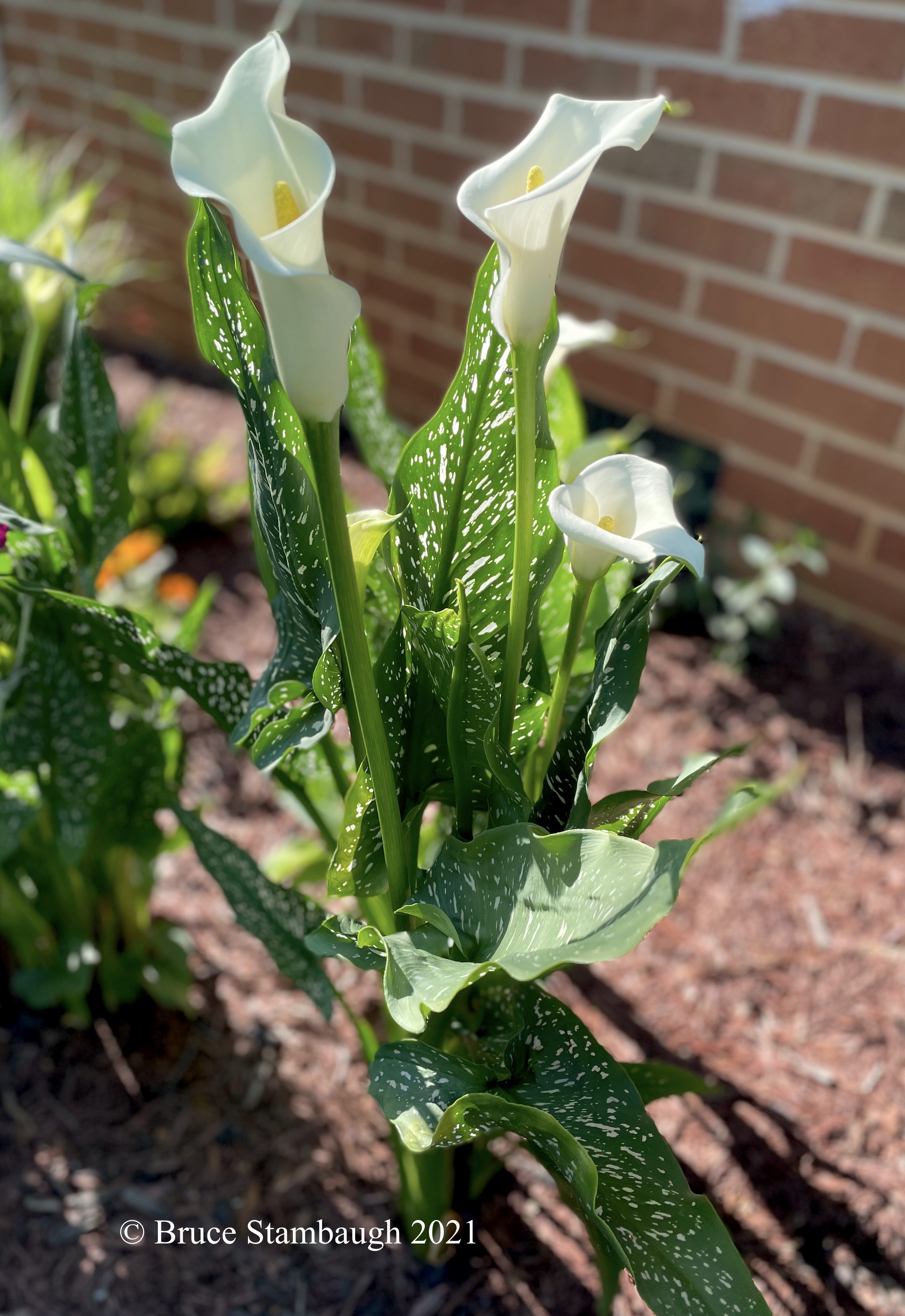 The evening sunlight made these Calla Lilies glow. Their variegated leaves only enhanced their beauty.
