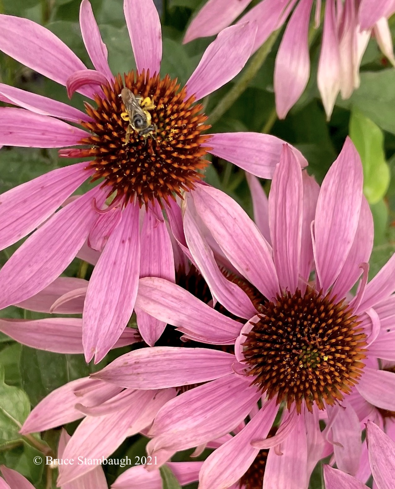The patch of lovely pink coneflowers drew me to them. The pretty flowerbed would make a nice photo. Then I spotted a lone bee atop one of the flowers. It sat motionless, as if resting. The amount of yellow pollen protruding from each side impressed me. I had to snap a photograph before it flew away.