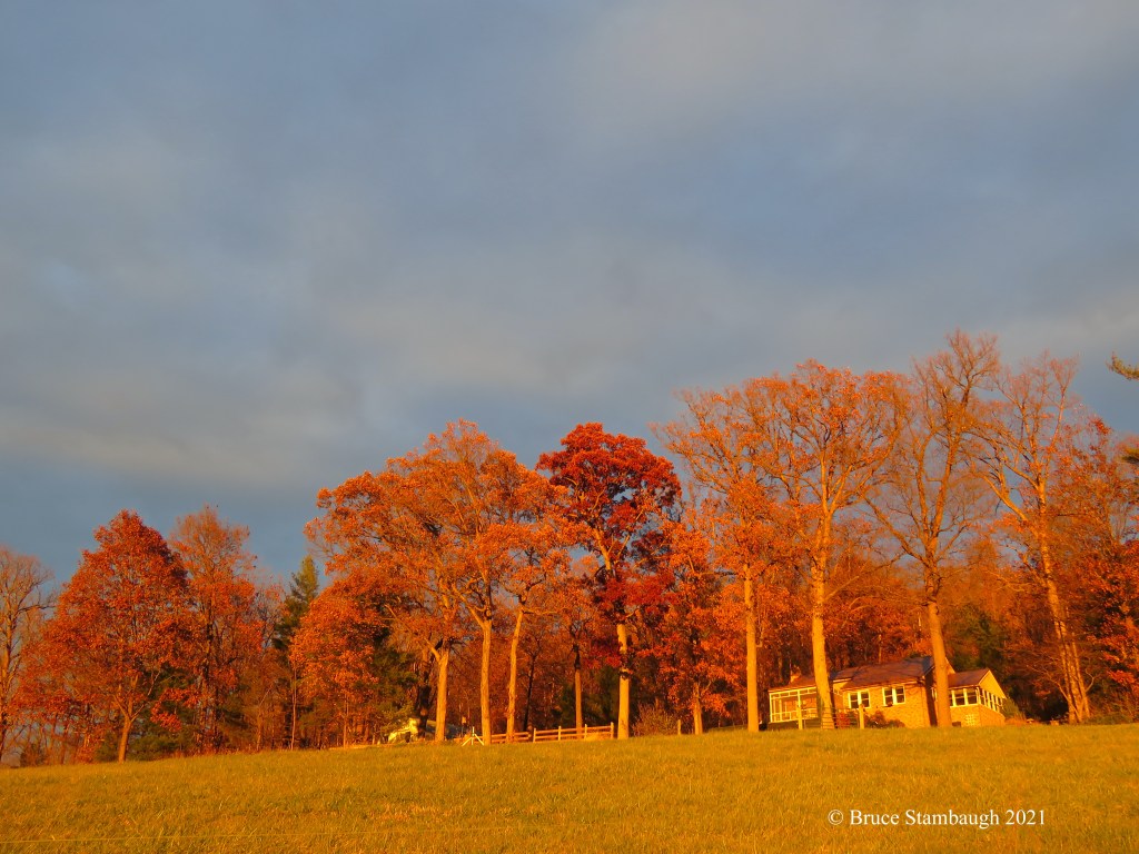 The sharply slanting rays of photography’s golden hour bathed the already russet leaves of the stand of oaks around this home. This photo is the way I shot it, with no tweaking needed.