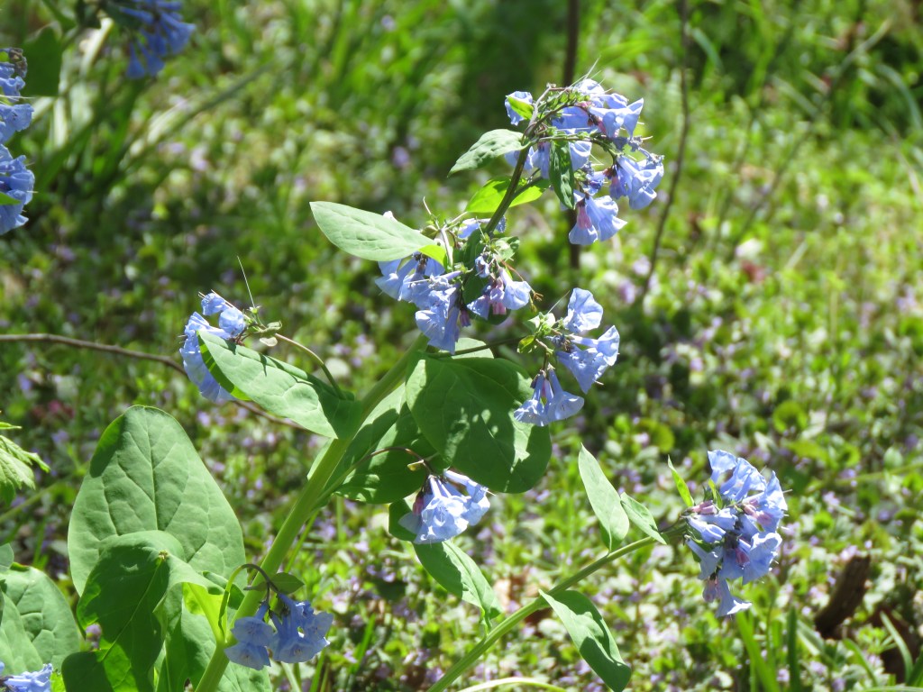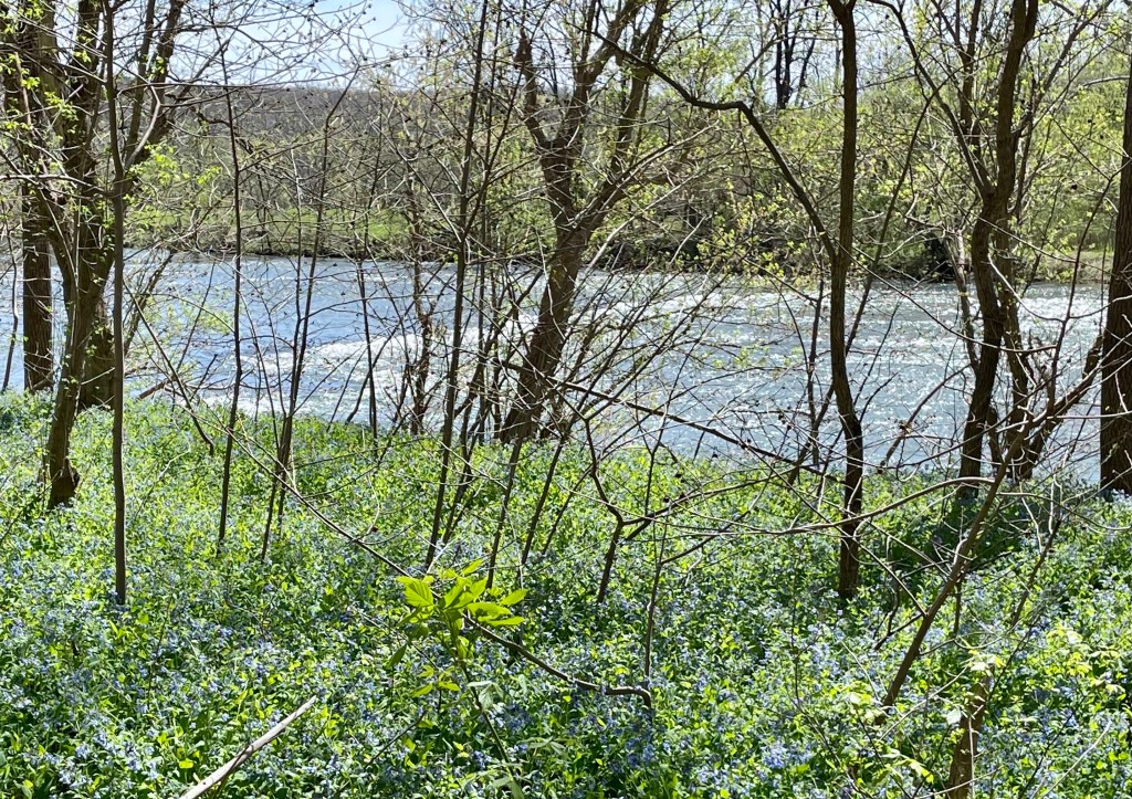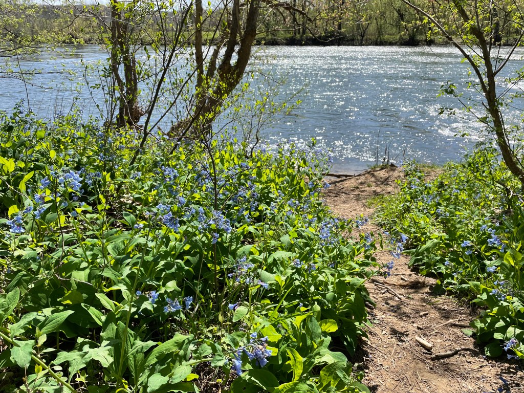 Once the trail straightened out, patches large and small of Virginia Bluebells spread across the forest floor like a blue and green carpet. They even lined the riverbank much of the time.