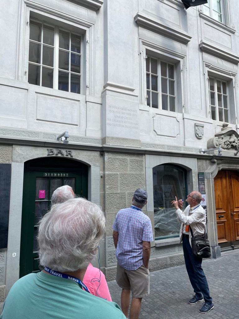 We also visited Manz’s mother’s home, where Conrad Grebel baptized Manz and others considered the Zurich rebels. We also saw the homes of Zwingli and Grebel. It was mind-boggling that these structures still stand, much as they were in the 16th century. Of course, they have been updated and some repurposed. Zwingli’s home is a theater, while Grebel’s is a bar.