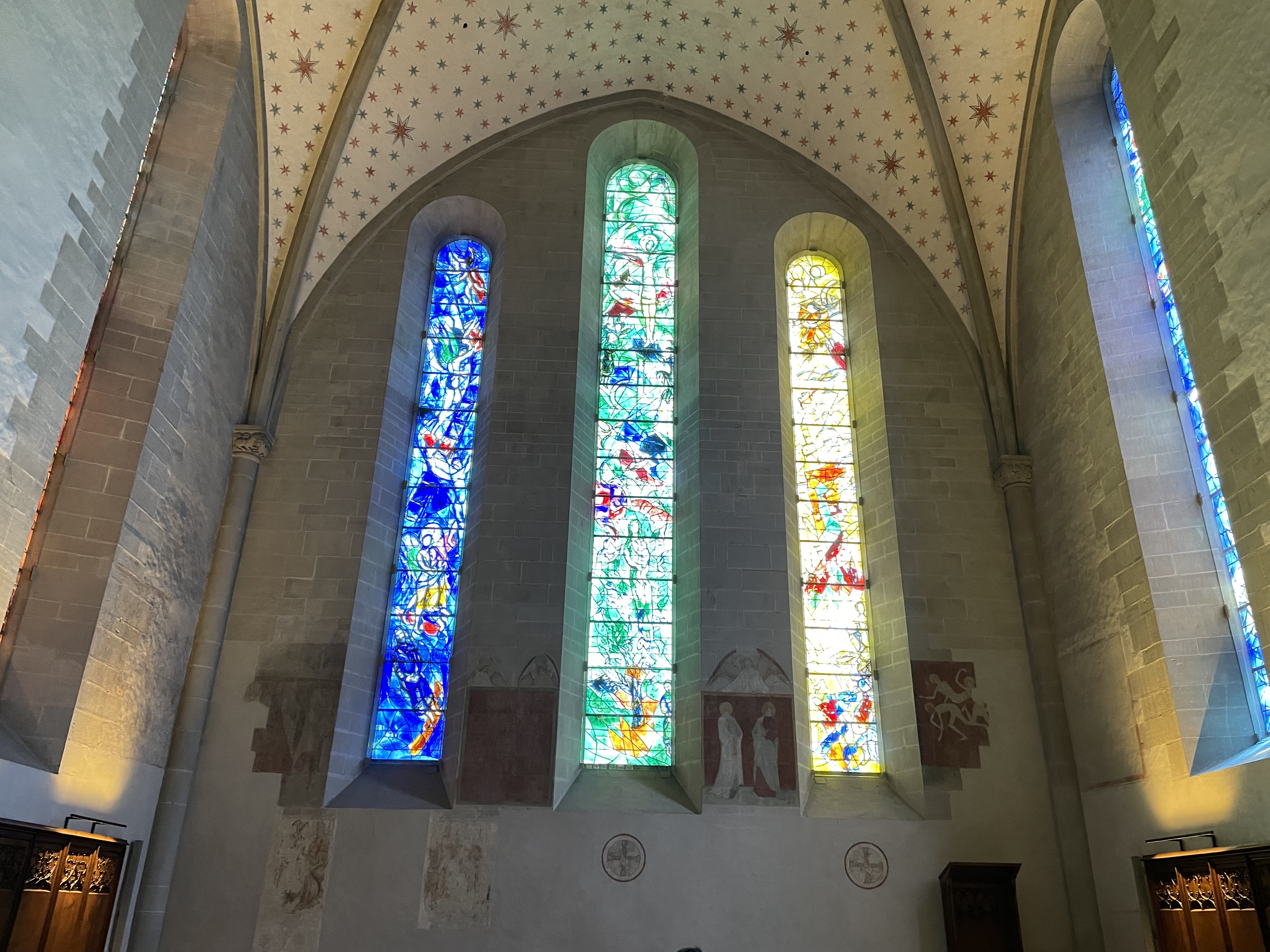 After a pleasant lunch in Munster Plaza, our local guide gave us a brief tour of the Fraumunster Church. He focused his time on sharing about the Chagall stained glass windows, which were beautiful. The pastel frescoes added a complementary contrast to the glorious colors of the Chagall windows.