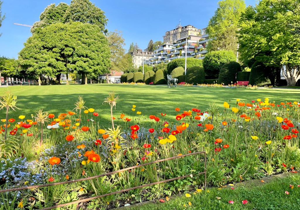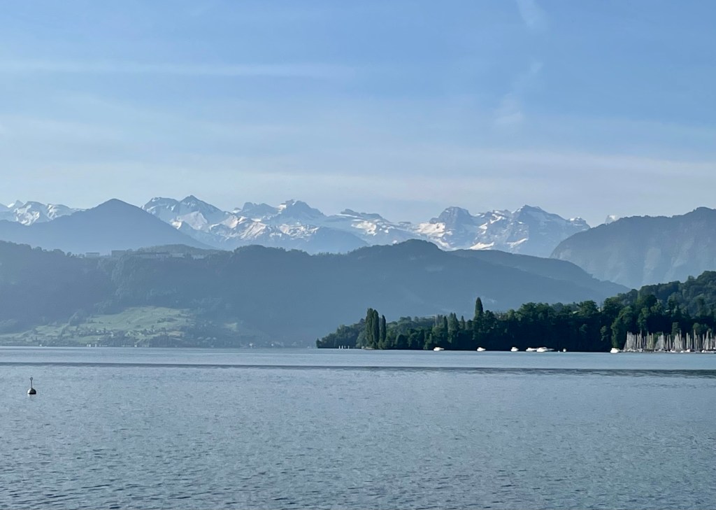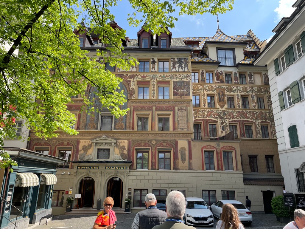 We arrived in Lucerne late afternoon and immediately began to explore the Old Town section. We enjoyed walking the cobblestone streets, viewing the many frescos on the old buildings, and listening to a school band play lively street music. We walked across the famous Chapel Bridge, too.