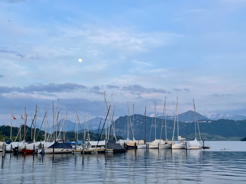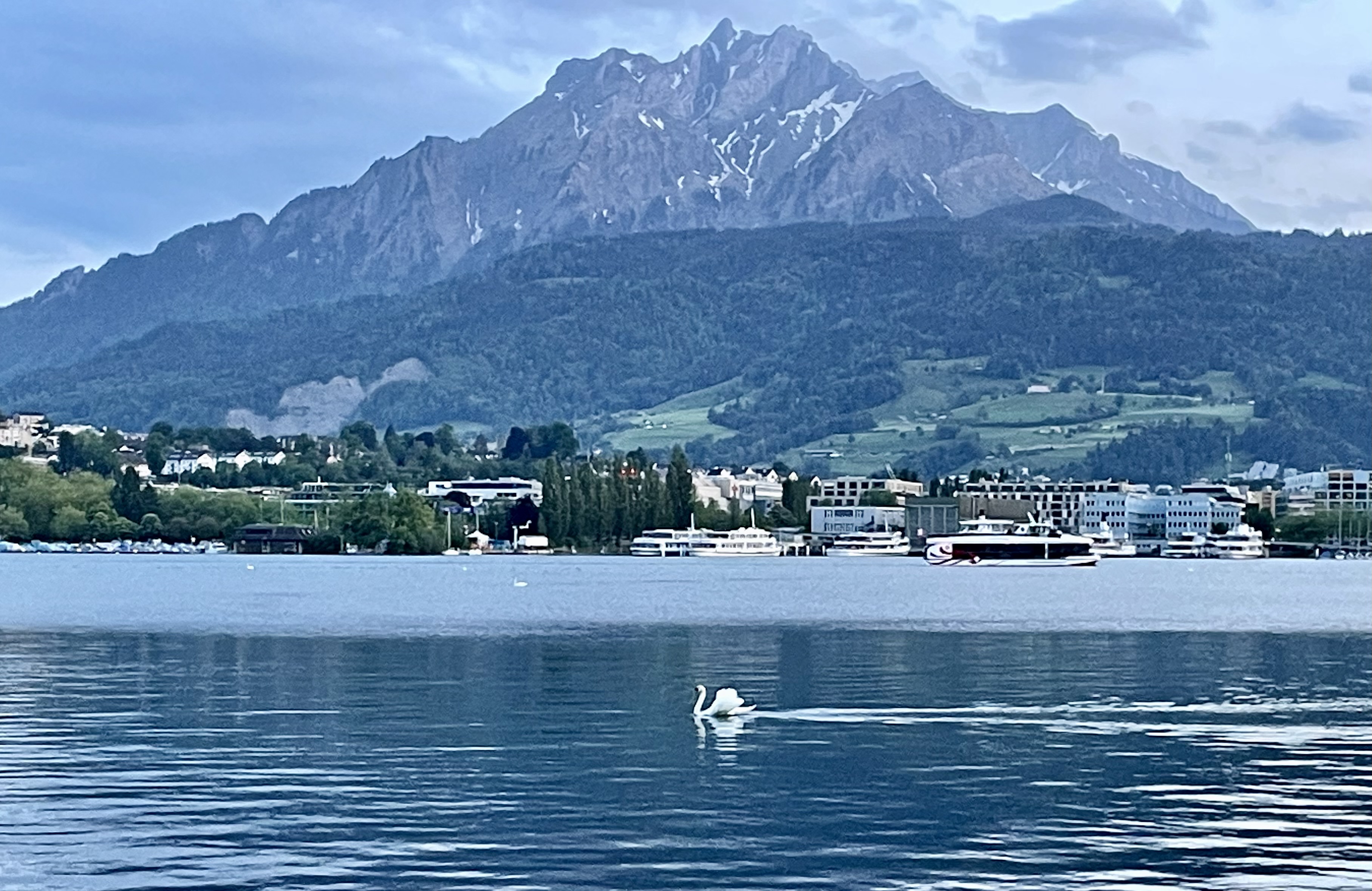 We stayed at the Grand Europe Hotel, which faced the beautiful Lake Lucerne. The lake lured me down to its edge that evening at dusk and again the following day after sunrise. The famous swans of Lake Lucerne added an exclamation point to an already gorgeous scene. Mount Pilatus stood mighty in the background.
