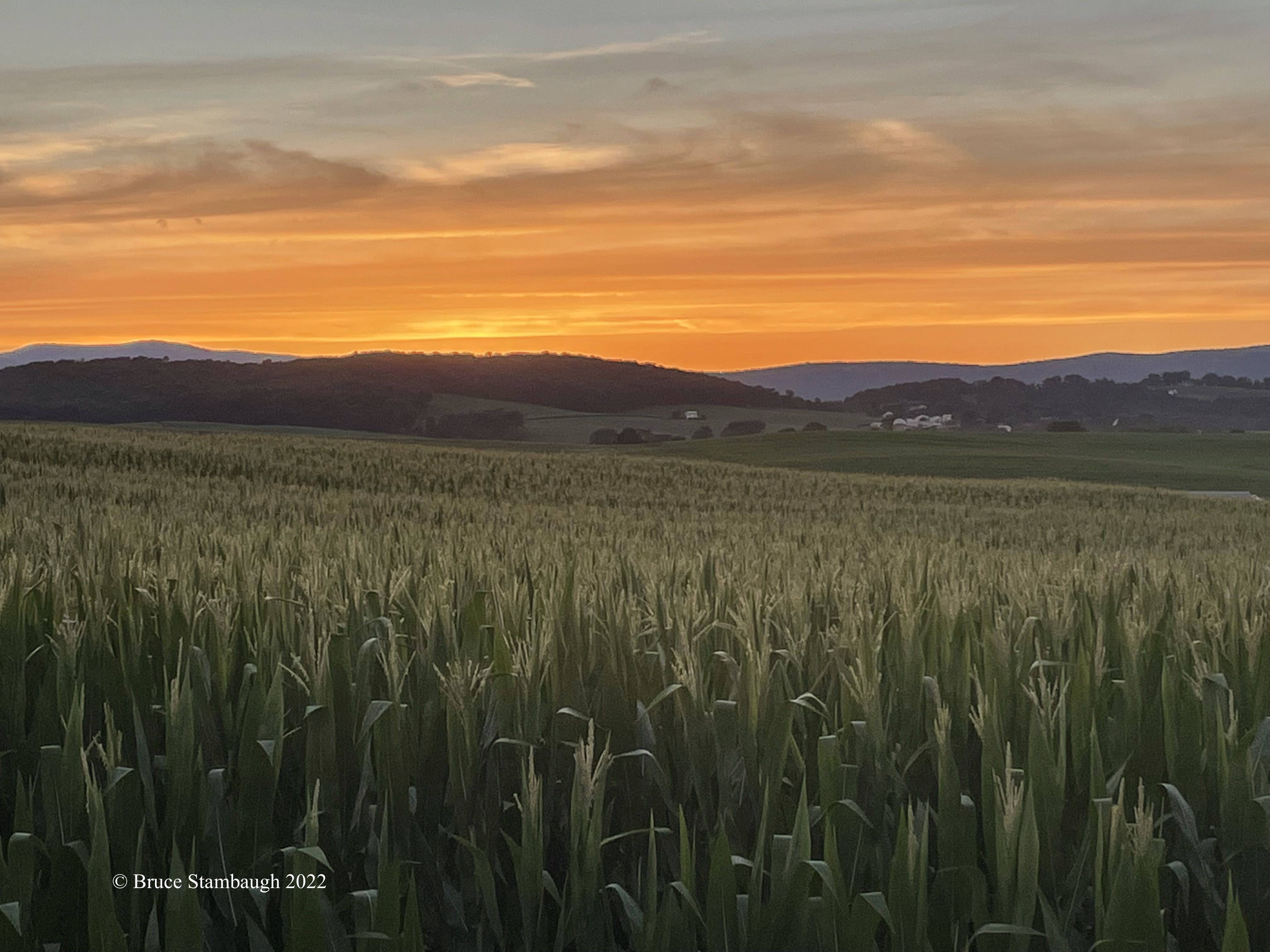 While the sunset wasn’t spectacular, something else caught my attention. The sweet fragrance of growing corn filled my senses. Then I noticed how the soft evening light highlighted the emerging tassels of the cornstalks. The flow of the large cornfield took my eye right back to the Allegheny Mountains and the setting sun.
