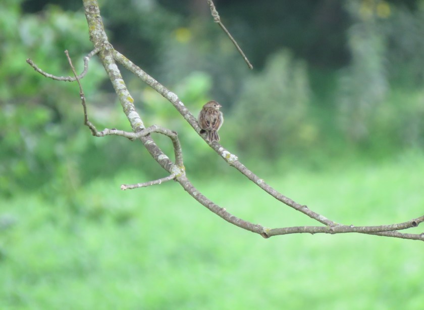 The sparrow sat dutifully on the tree limb while the walk’s leader edged closer. Finally, it turned its head, revealing its pinkish bill. Field Sparrow, it was.