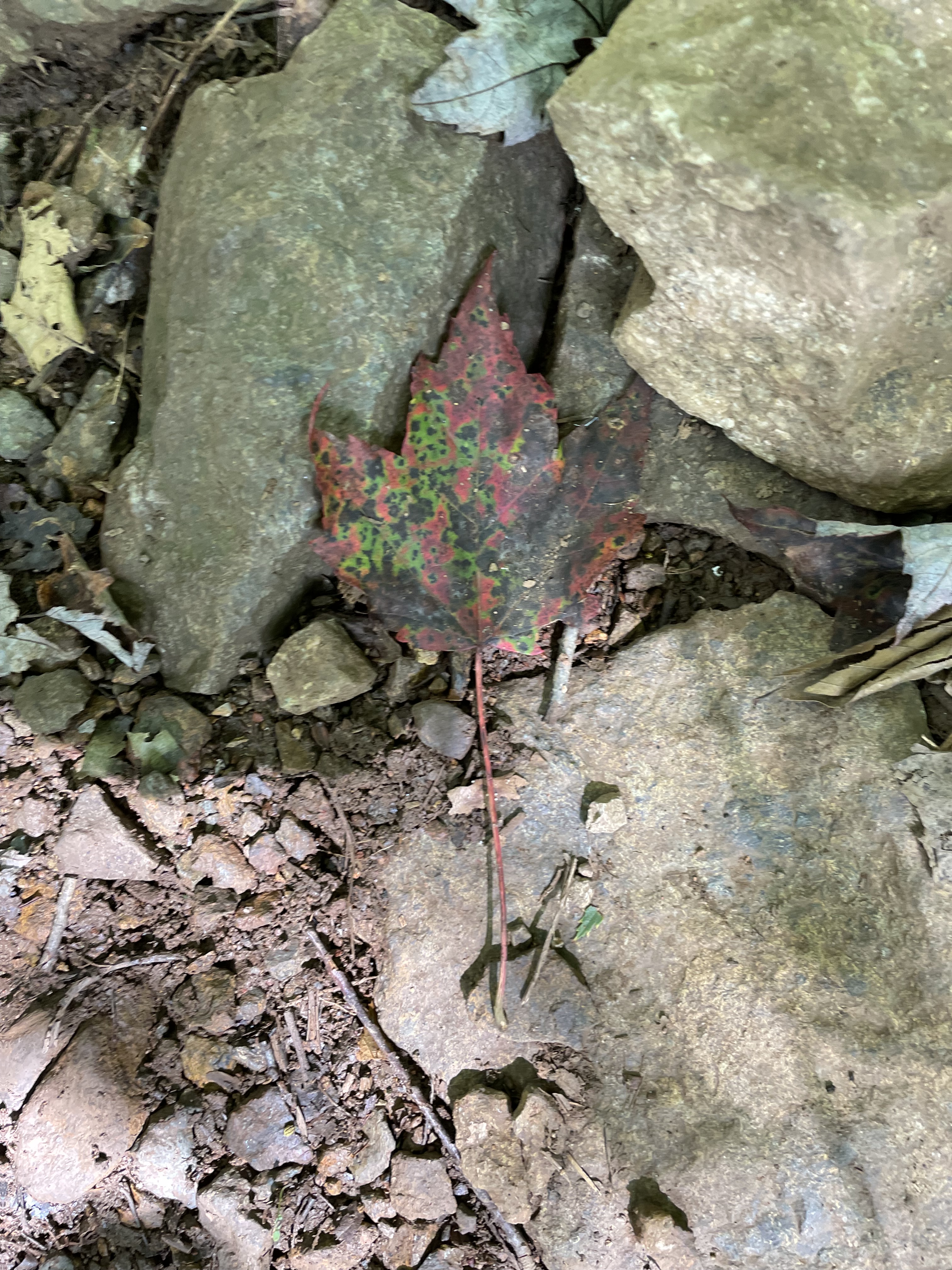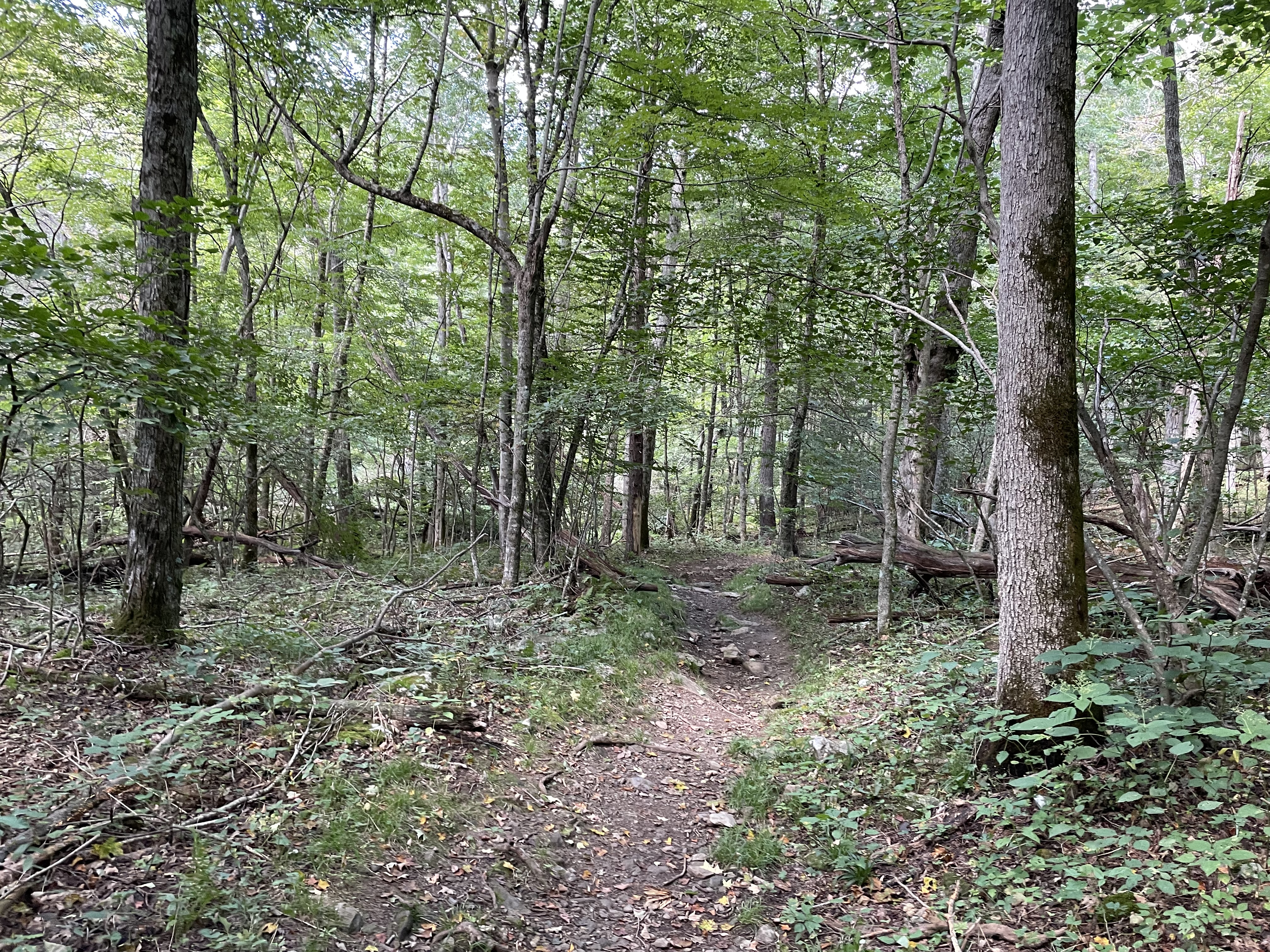 Then it was time to head back up the gradual incline. The trail effortlessly wound its way past outcroppings, back across the two forks of the Mill Prong, shaded all the way by a mixed hardwood forest. It was already shedding some of its leaves.