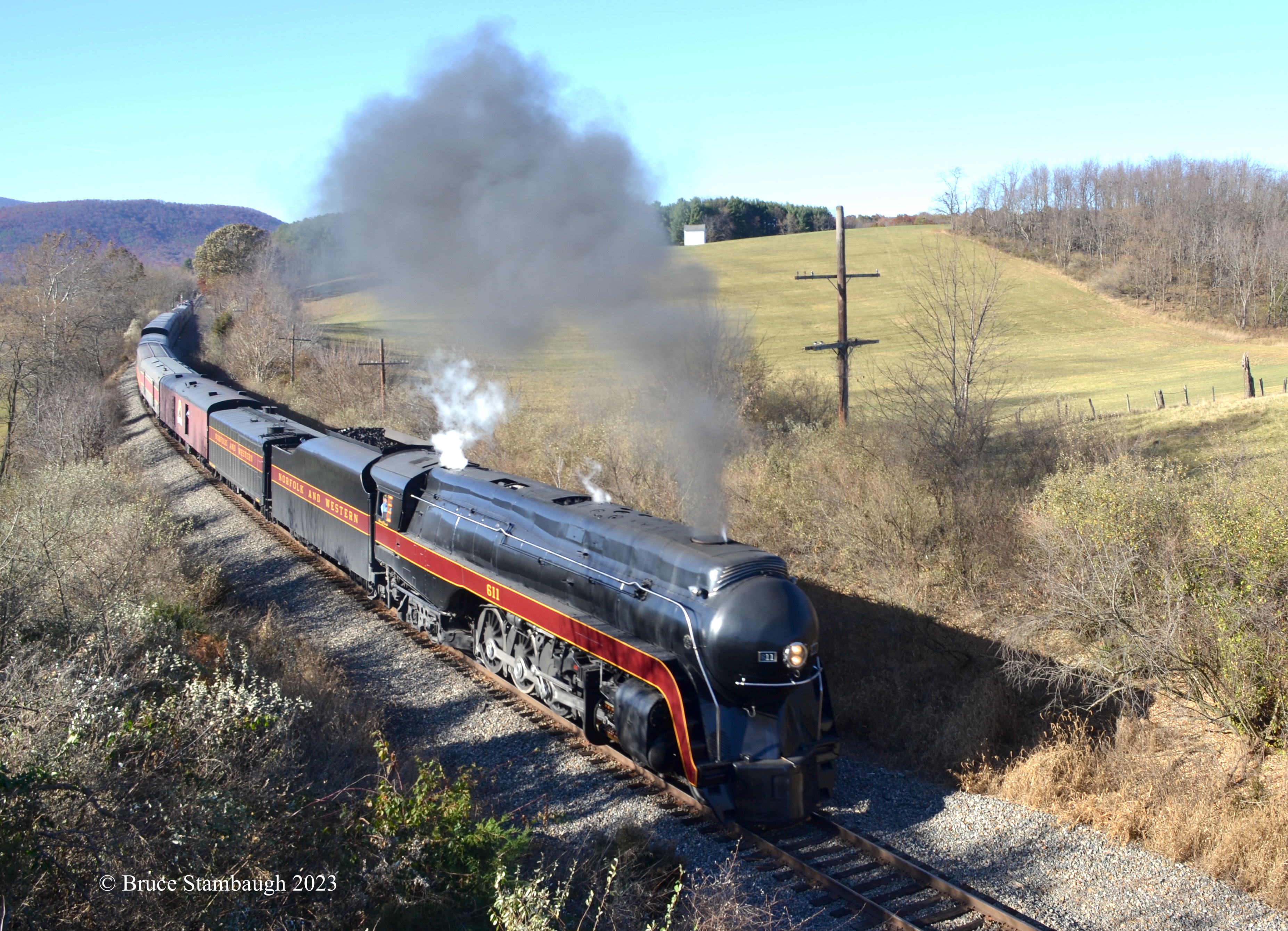 As it happened, a famous steam locomotive, “Old 611,” “Spirit of Roanoke,” or the “Queen of Steam,” was pulling another excursion the same day as our ride through Virginia’s lovely Shenandoah Valley, where we live.