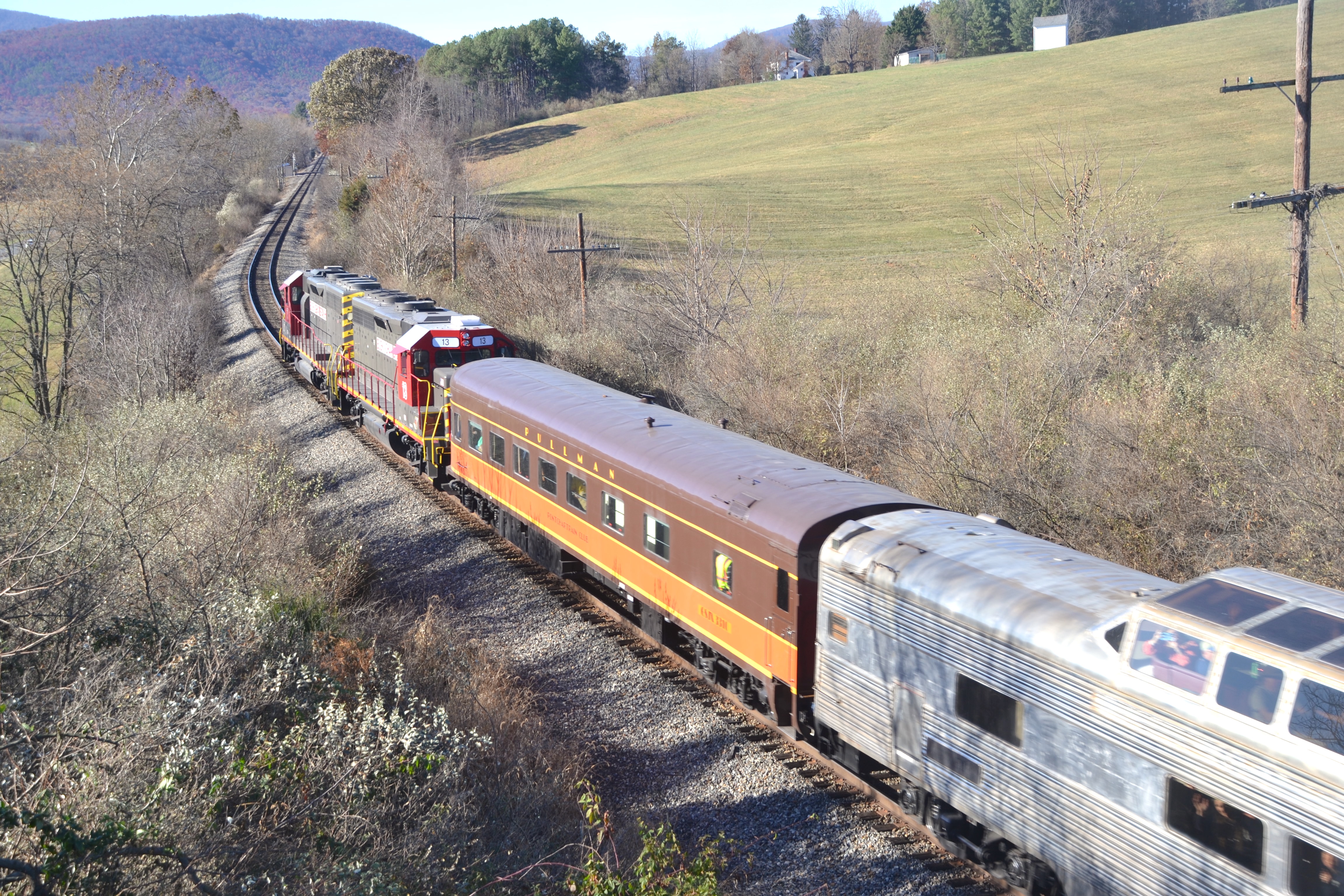 First, we had unexpected treats. An eastbound Amtrak Cardinal train zoomed by, followed by a westbound one an hour later. They were opening acts for the main event, the 611.