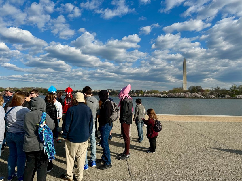 Several people in various attire mingled at the Jefferson Memorial. Professional and amateur photographers clicked away at couples in frilly gowns and fancy suits and high school and college graduates in flowing robes. Teachers and adult chaperones of elementary, middle, and high school student groups herded their darlings into huddles for impromptu lessons.