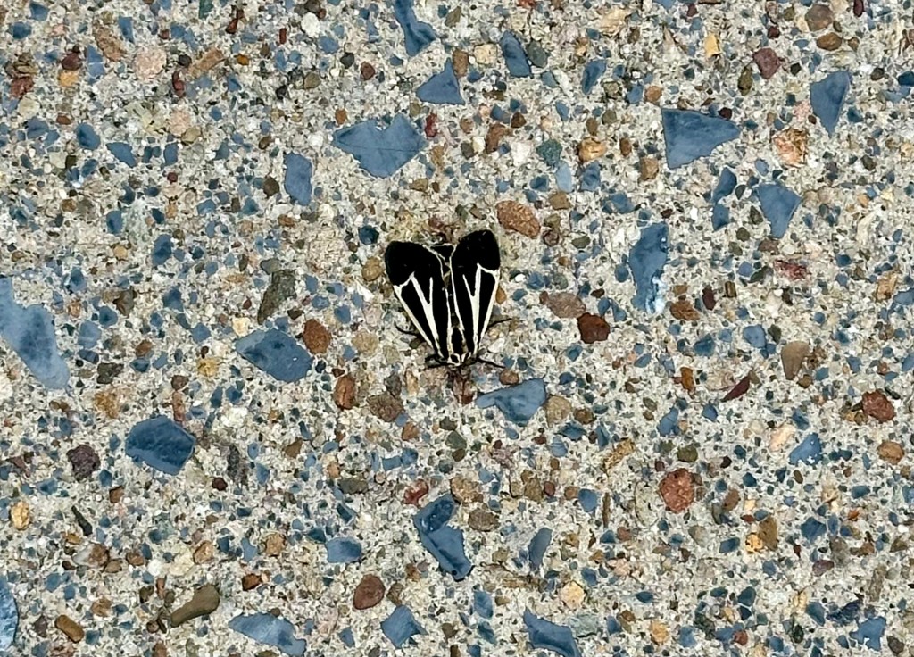 No bigger than a 25-cent piece, this moth caught my eye as I walked out to get the mail. Its contrasting black and yellow wings stood out from the marbled pattern of our decades-old, well-worn concrete driveway.