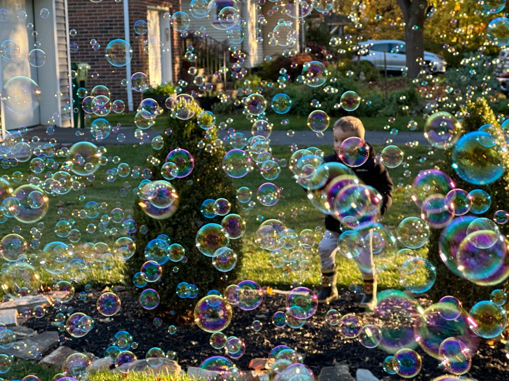 When Teddy ran behind the bubbles, the sharply slanting sun highlighted the multi-colored, windblown bubbles. The various-sized bubbles and their proximity to my camera created a moment I can’t forget. It was one of my favorites of the year.