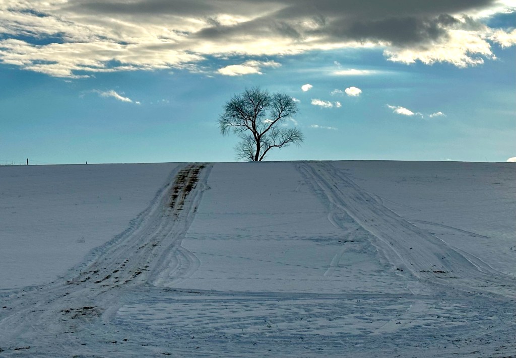 It’s only appropriate to begin this photo series with a snowy scene in January. This lone tree stood beneath the hovering clouds and was perfectly centered by the farm equipment tracks in the snow. The cerulean sky provided an excellent backdrop, like blue ice in a glacier.
