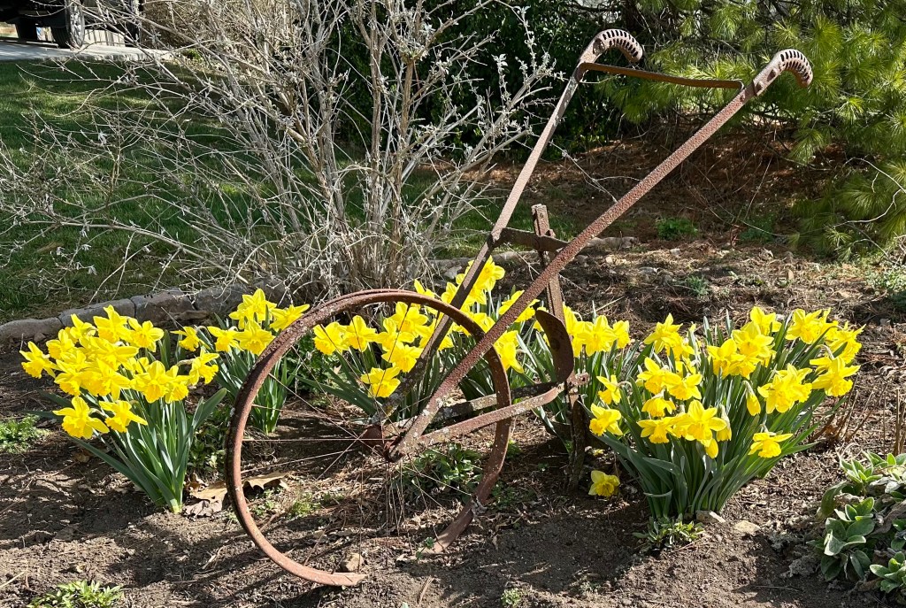 Emerging from winter, the buttery yellow of the blooms added a splash of color that complemented the old, rusting implement.