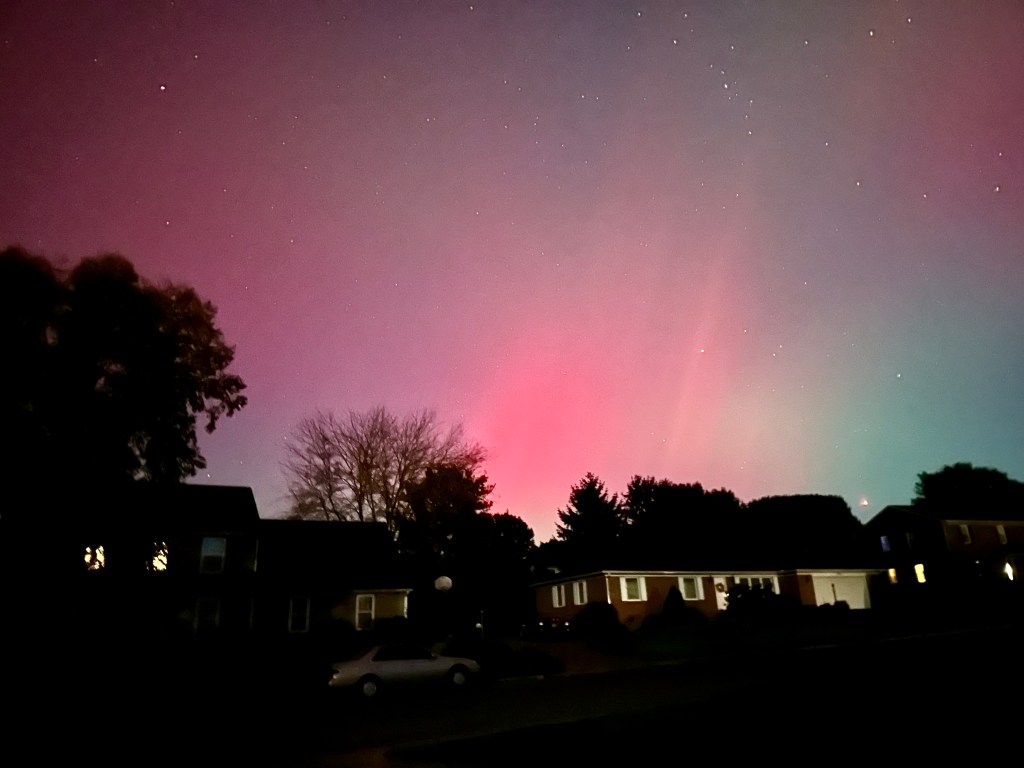 I was determined to make the aurora my priority after dark on Tuesday night. I again stepped into the darkness of our neighborhood and immediately saw reds and pinks in the sky, especially to the northwest. It is one advantage of having no street lights in our housing development. Of course, the colors I saw can’t compare to the amazing shots of curtains of colors dancing in the sky in the northernmost latitudes.