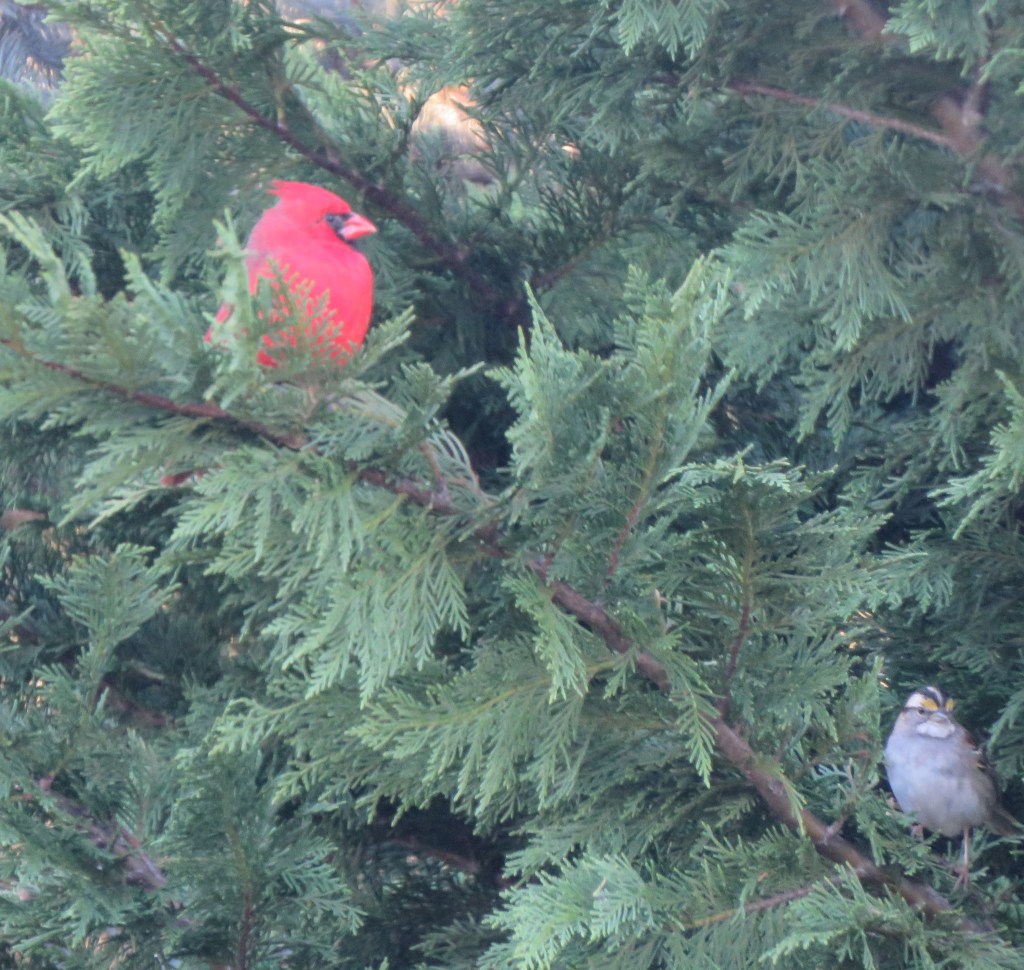 When I uploaded the photos to my laptop, I had no idea that the White-throated Sparrow had popped out of the dense foliage. It wasn’t in any of the other photos. I cropped the photo because the sparrow is barely in the frame.