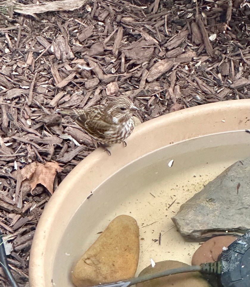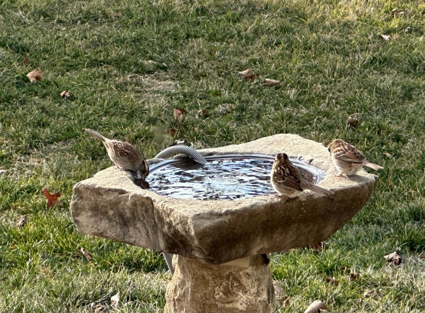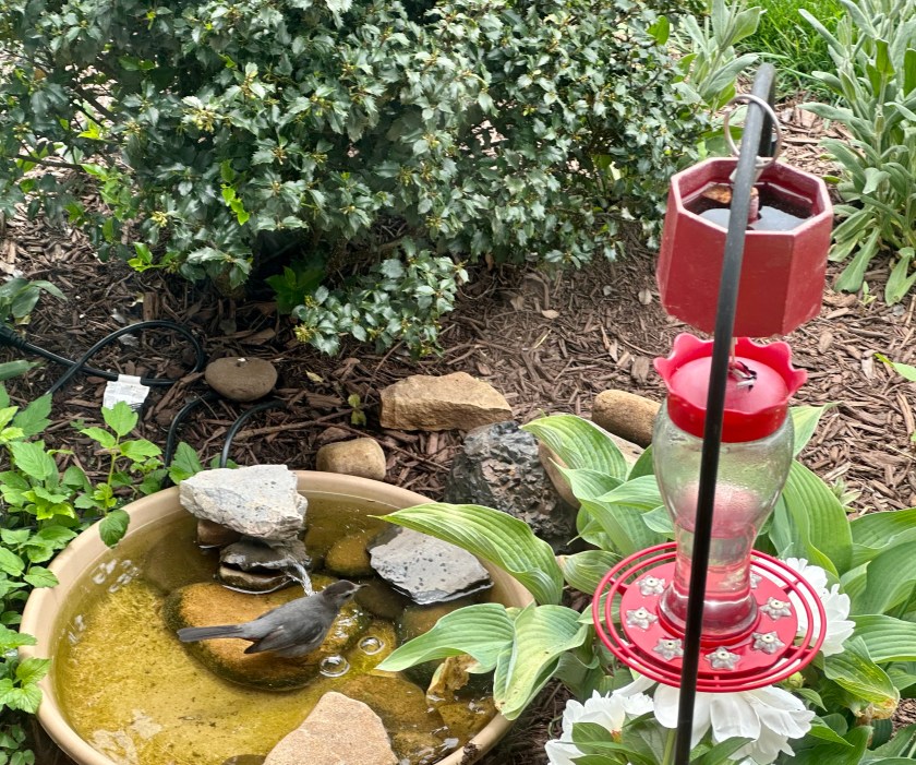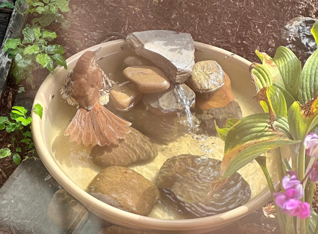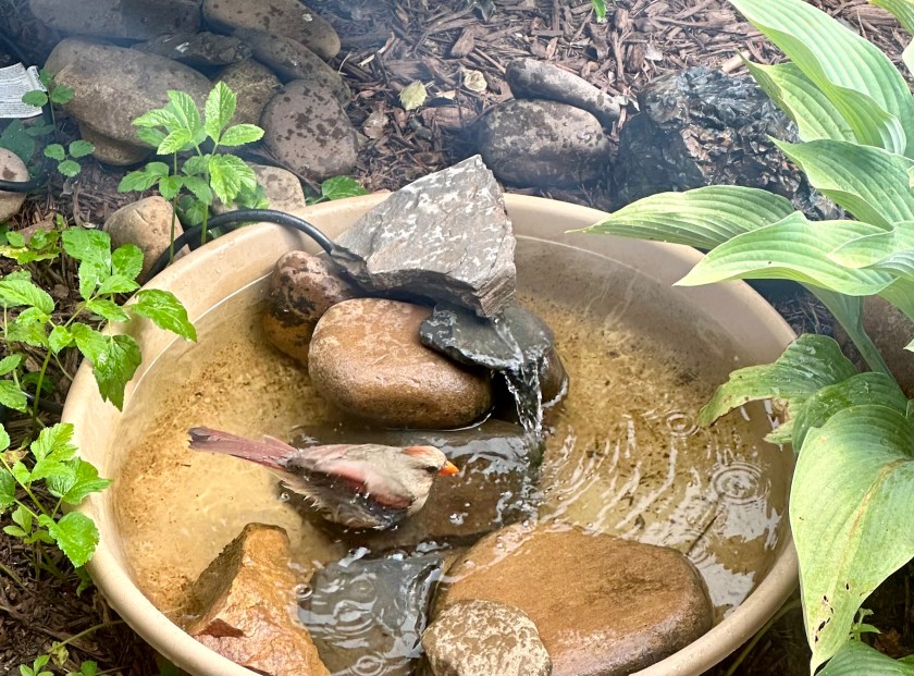 In addition to establishing bird feeders, providing water enhances birds’ attraction. Adding a small pump surrounded by mostly flat stones to create a gurgling sound also brings birds, both migrating and residents, to feeders and birdbaths. The stones provide perches for the smaller songbirds. If the water slows, the pump will likely need to be cleaned as well.
