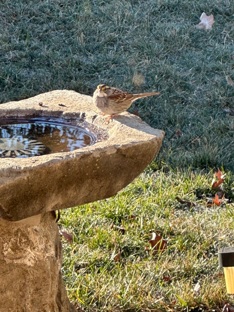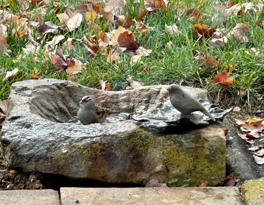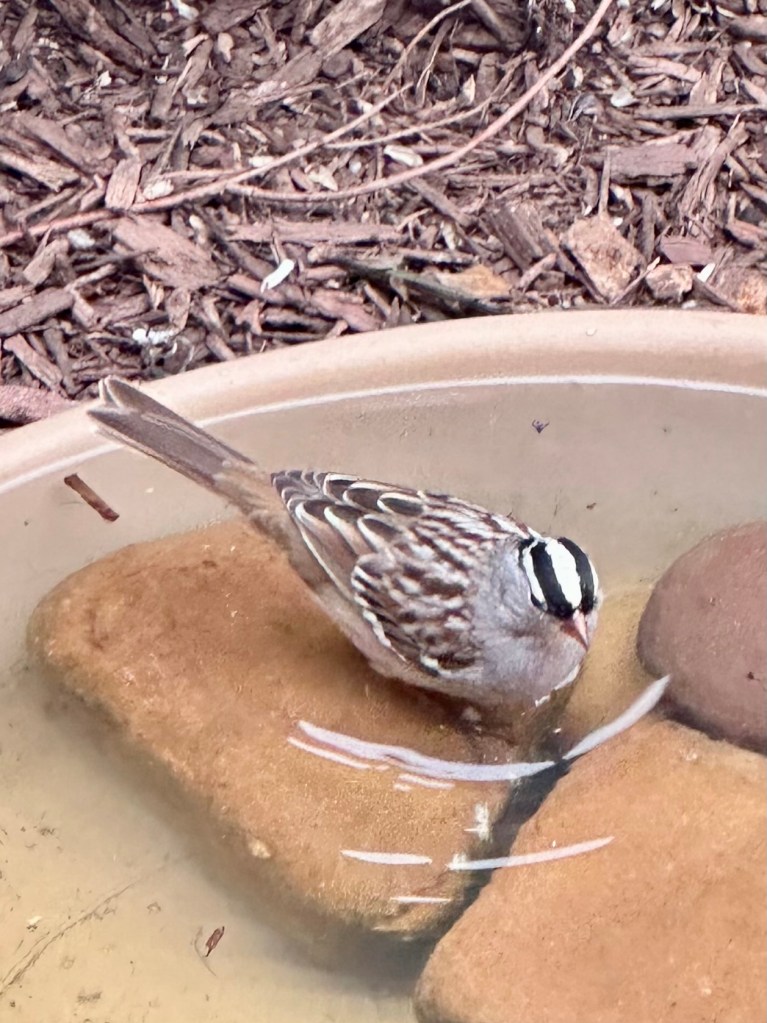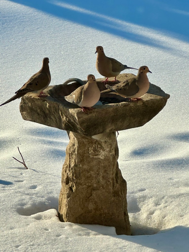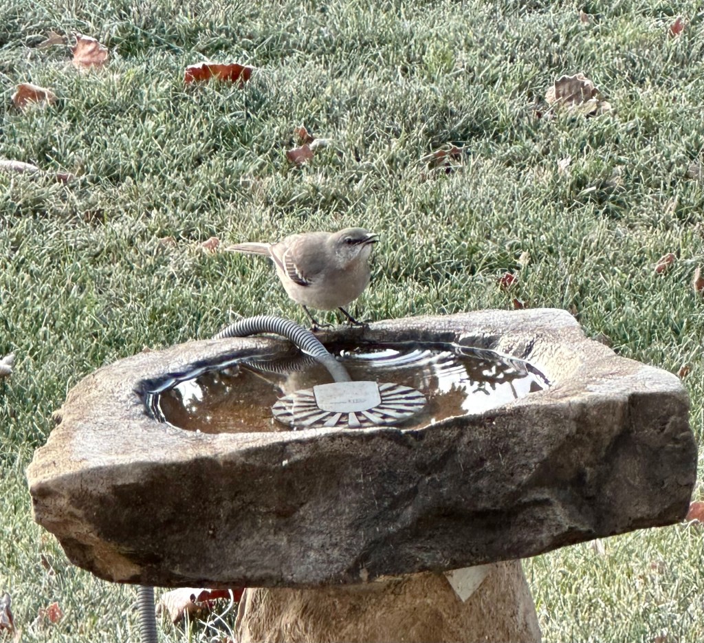 In addition to establishing bird feeders, providing water enhances birds’ attraction. Adding a small pump surrounded by mostly flat stones to create a gurgling sound also brings birds, both migrating and residents, to feeders and birdbaths. The stones provide perches for the smaller songbirds. If the water slows, the pump will likely need to be cleaned as well.