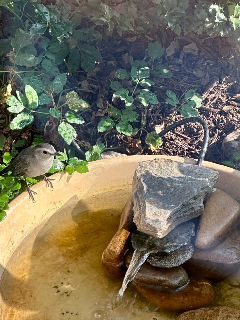 Adding a small water pump, fountain, or even a small waterfall increases the likelihood of attracting birds to water, especially songbirds. Birds will hear the trickling sound and take that as an invitation to drink and bathe.