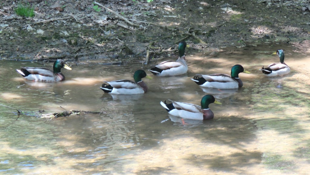While birding in a local arboretum, I came across this group of male Mallards casually swimming in Cooks Creek. They seemed undeterred from the purpose of their outing by my uninvited appearance.