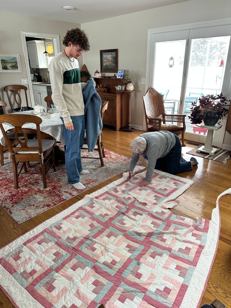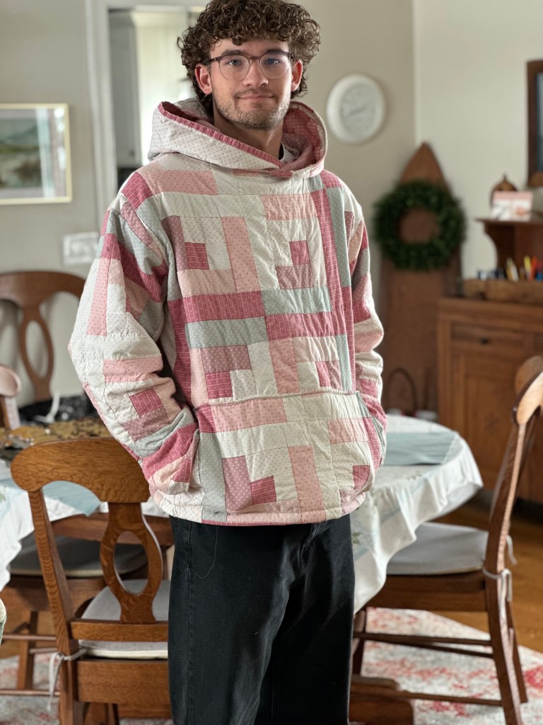 Our grandson had a specific plan. Inspired by a video he saw on YouTube, Davis wanted to make a hoody out of an old quilt. Fortunately, my thrifty wife had a few on hand, including the quilted bed covering she made that Davis’s mother used at bedtime growing up.
