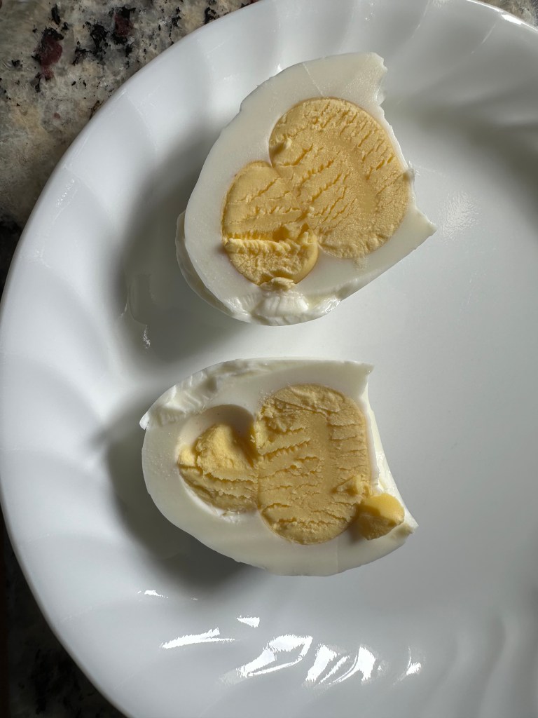 When my wife sliced open the egg, she found a surprise. The egg didn’t contain a double yolk, but a yolk and a half. I’m not sure how rare that is, but extensive Google research showed that a double yolk is a 1 in 1,000 chance.