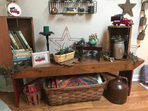 With each completed display, the memories flowed. Barn wood-framed antique Christmas postcards hang near the front door, welcoming all for the holidays. My late father made the frame years ago.