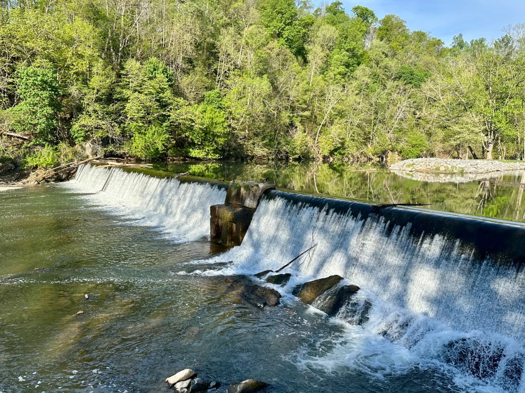 In fact, if you look closely, you can see a Turkey Vulture soaring over the tree tops in the lower right-hand portion of the photo. The reason the river appears so calm is a low-head dam a few yards downstream that backs up the water. The water below the dam is the river’s normal level.