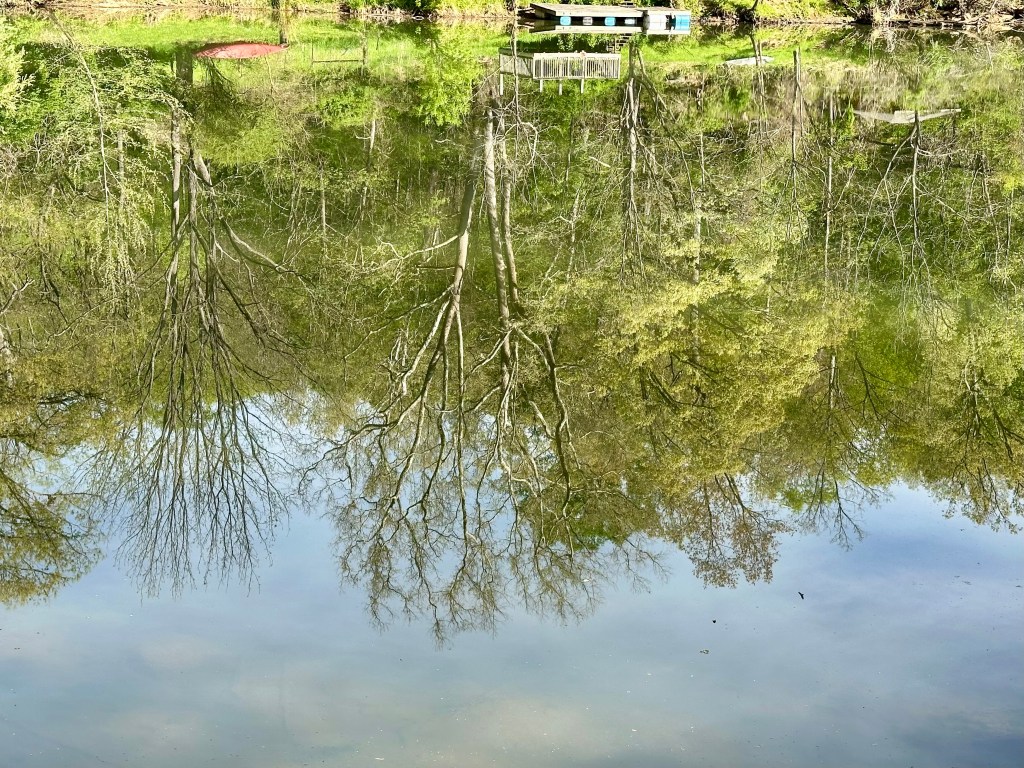 The photo is not upside down, and it’s not an illusion. This image is exactly as I took it during a recent bird walk with about a dozen people in a park in Bridgewater, Virginia. The reason the trees seem to be growing down instead of up is that this is simply a reflection in the classy, calm North River.