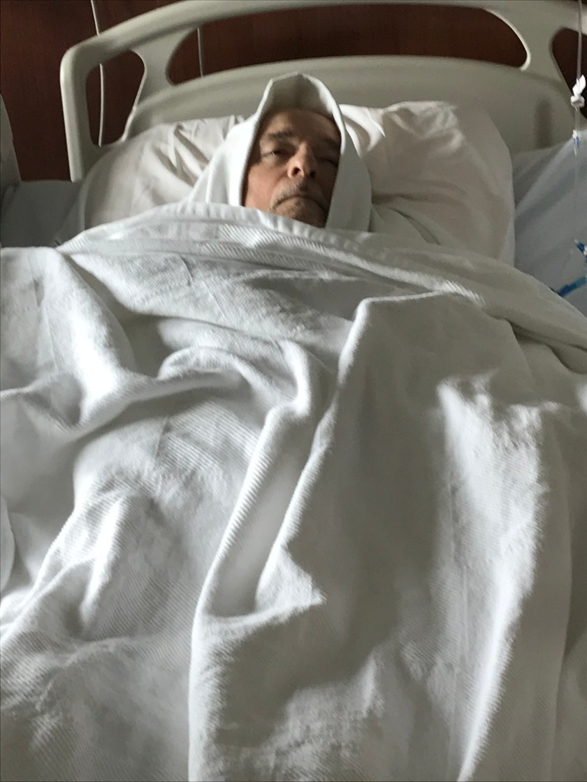 The reason I am all bundled up in blankets was that the room was freezing. Apparently, housekeeping had turned down the air conditioning temperature to 50 degrees Fahrenheit and forgot to reset the thermostat when they left. The kind nurses gathered pre-heated blankets to warm me up. Since the anesthesia still had its effect on me, I was mostly out of it when Neva snapped this photo.