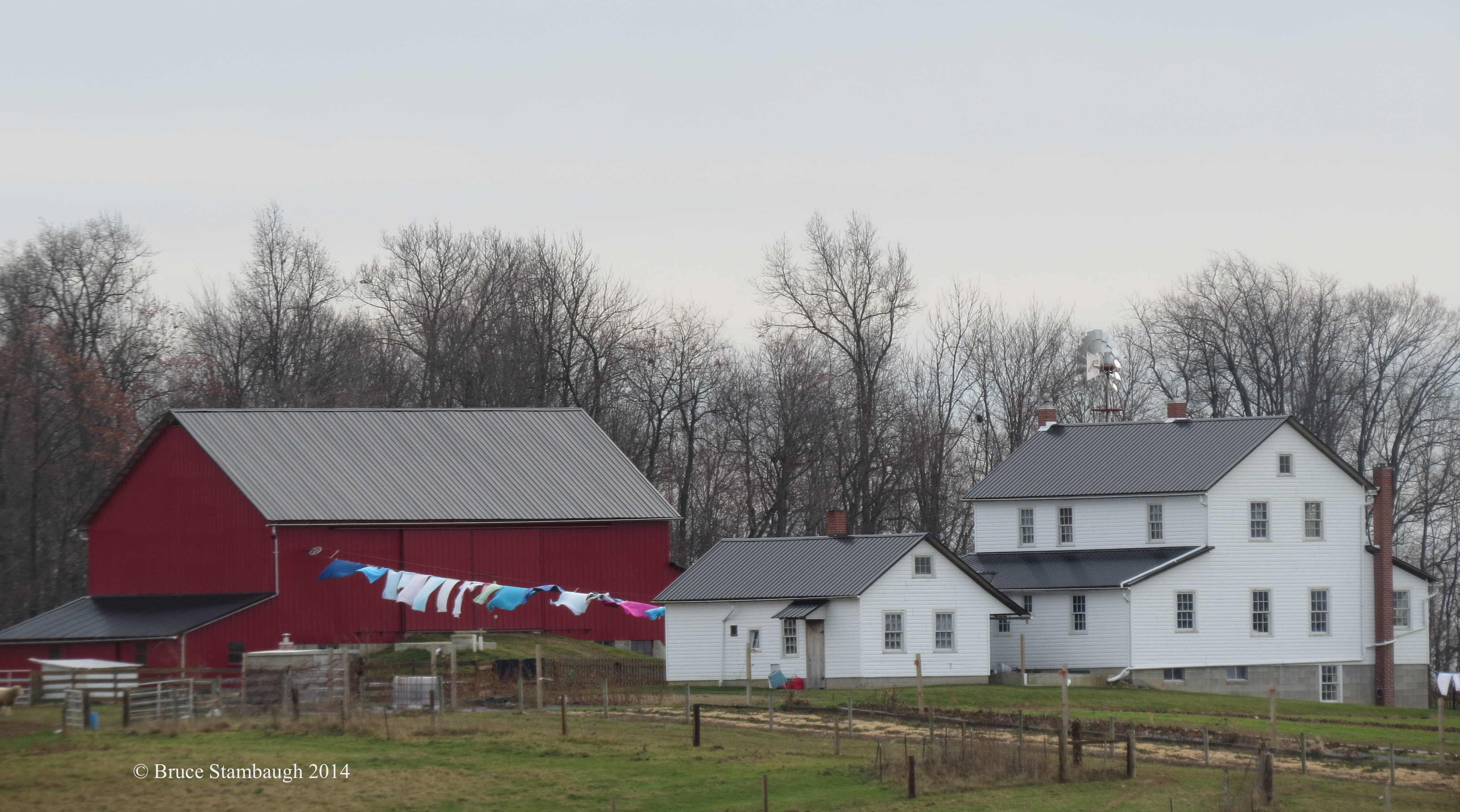 As is evident in this photo, the Amish have become quite adept at stringing the wash so that it does not interfere with children, animals and implements can move freely around the yard. In this case, a sturdy line was affixed to a pulley high on the barn siding. The line connects to a similar pulley on the wall of the outbuilding. This makes it very convenient to hang the laundry without having to endure the wintry elements of a typical northeast Ohio winter. The pulley moves so that clothes are hung one garment at a time.