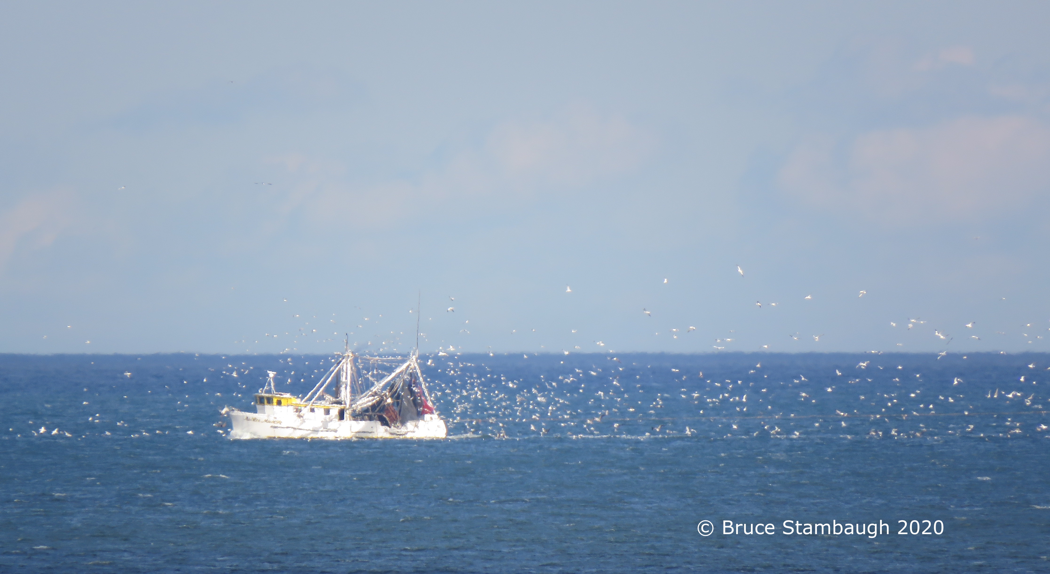 The timing couldn’t have been better. With the late afternoon sun shining brightly, this shrimping trawler headed for port to unload the day’s fresh catches. Clearly, the boat and its crew weren’t alone.