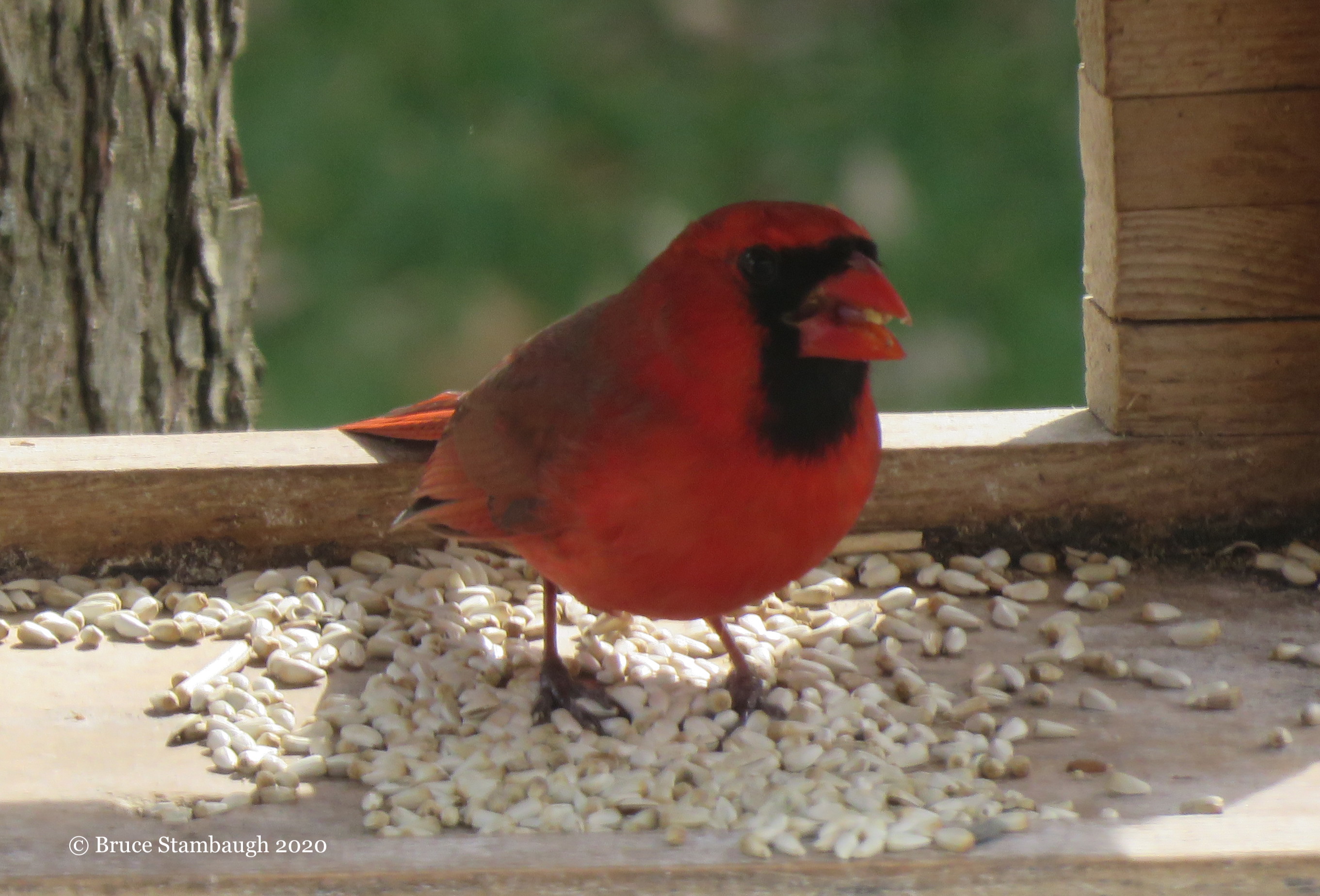 I caught this male northern cardinal chowing down on safflower seeds that I had set out for the few birds that will eat them. European starlings and common grackles won’t touch the seeds. So if they are hogging the other feeders that contain black oil sunflower seeds, the cardinals and other songbirds help themselves to the bleach-white offerings.