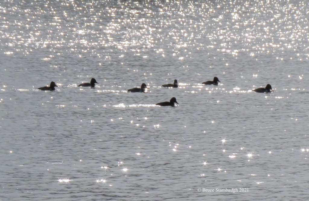 On a recent afternoon, I found this flotilla of ducks in the sparkle of the afternoon sun at the south end of the lake. Among this group were Ring-necked and Redheaded Ducks and Greater Scaups.