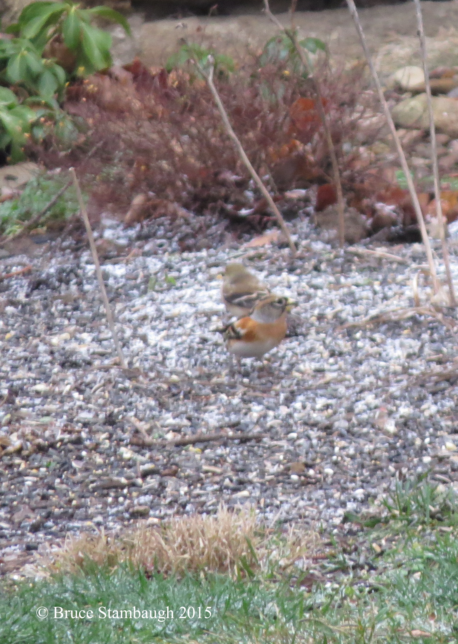 Like humans, birds behave in routines, too. The Brambling flew to a small, stunted bush by the chimney of the house, checking its surroundings. Soon it again fed on the ground among finches and Northern Cardinals to the clicking of cameras and satisfied smiles of birders whose ages spanned three generations.