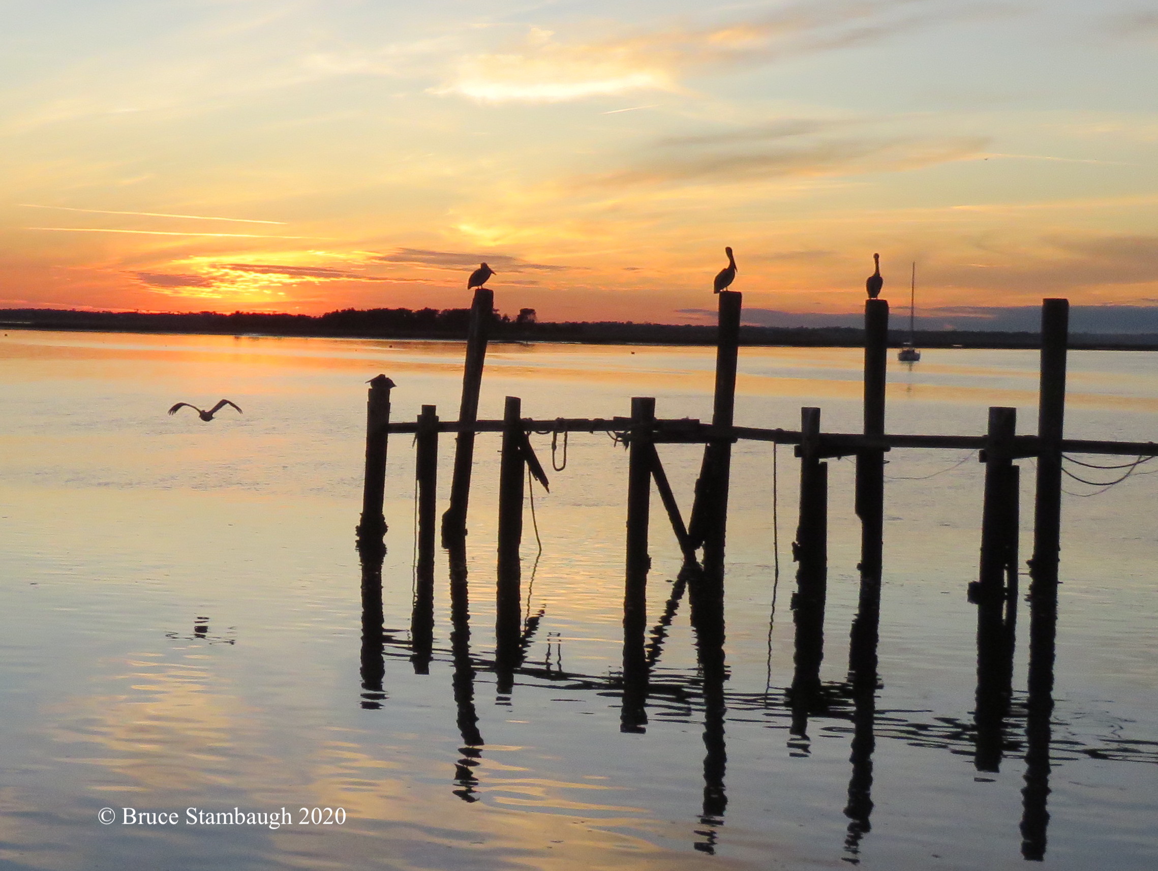 Brown Pelicans arrive to roast for the evening along the Amelia River, Fernandina Beach, FL.