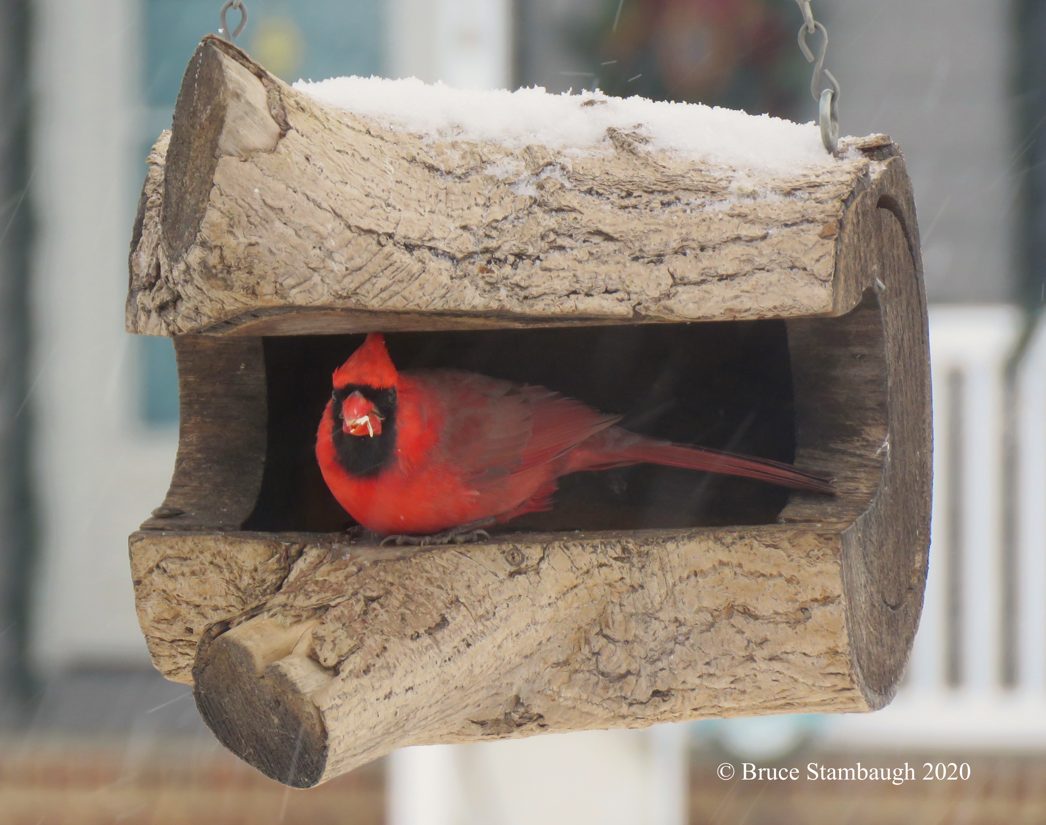 The male Northern Cardinal in the photo waited on a branch above the feeding frenzy, awaiting an opportunity to fuel up undisturbed. That allowed me to capture the brilliant red in the falling snow.