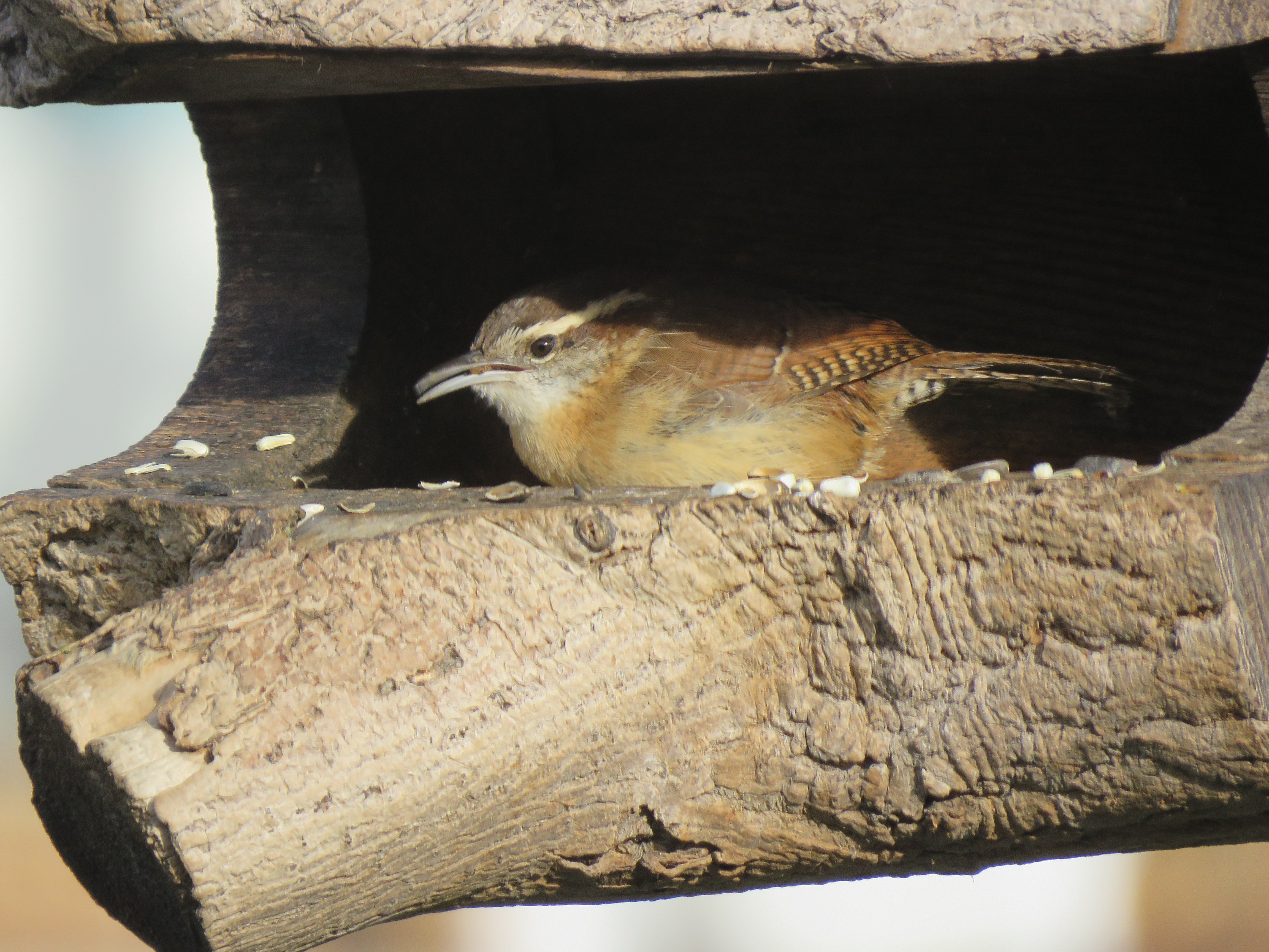 One particular white-throated sparrow prefers the confines of a hanging feeder made of a hollowed-out limb. This sparrow jumps and kicks at the safflower and black oil sunflower seeds as if it were on the ground scratching for food. That’s what the rest of the white-throated do.