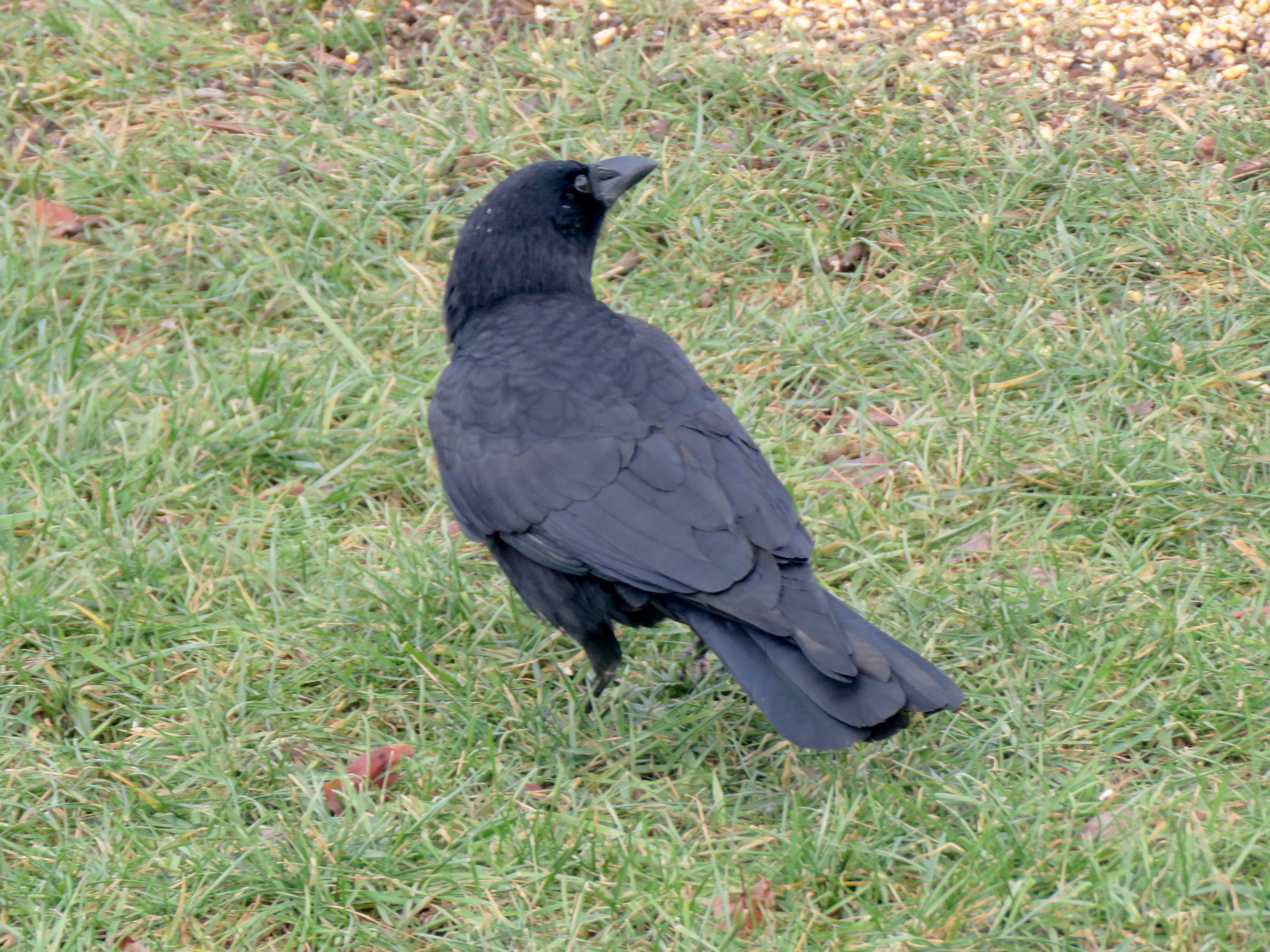 Recently, a lone American crow began visiting. It feeds on the cracked corn spread beneath the red maple. I know it’s the same bird because of its persistent limp.