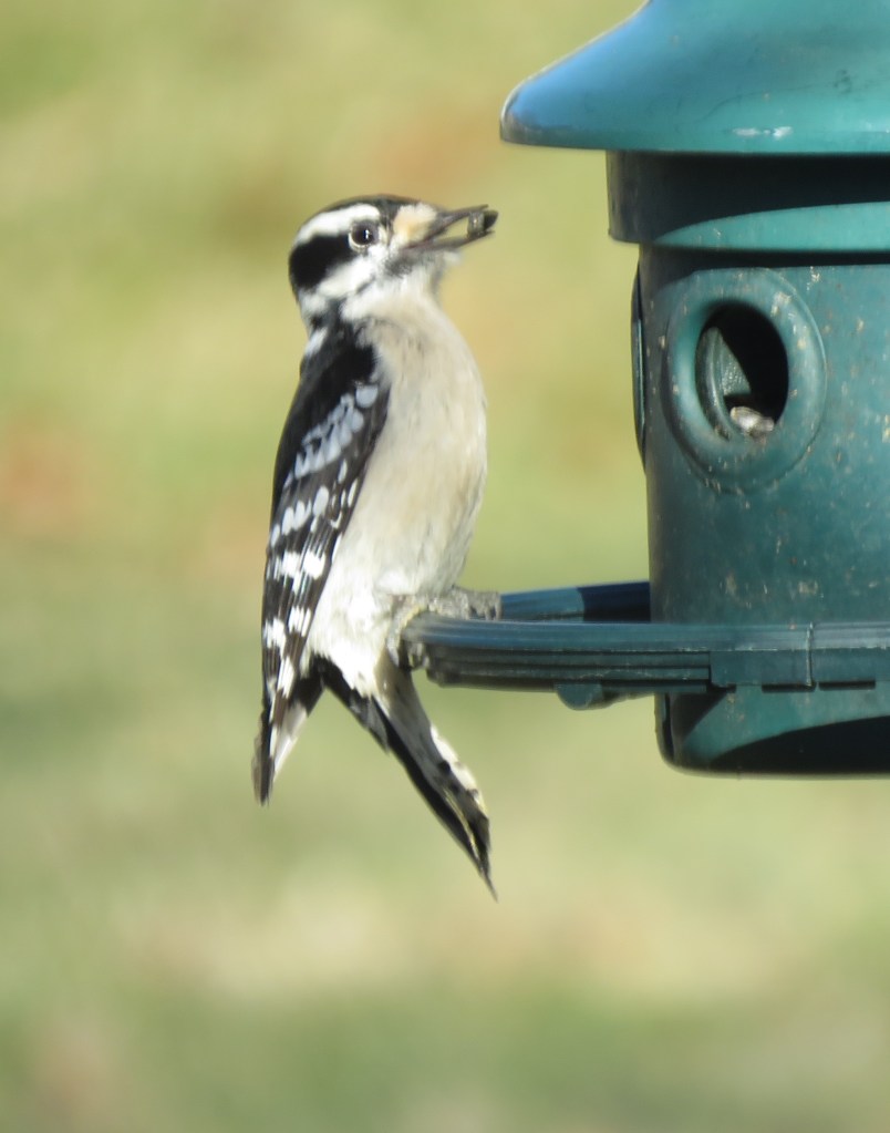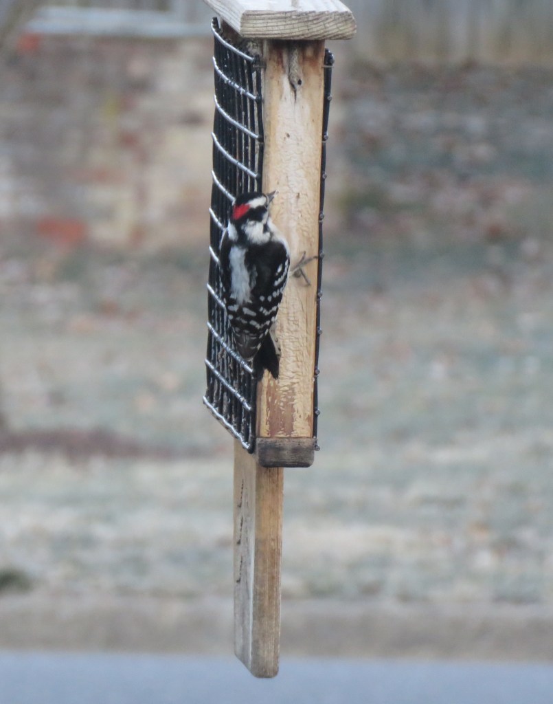 The Downy Woodpeckers are the most discrete. Their soft squeak or rapid-fire drumming on a tree limb gets my attention. Other times they just show up.