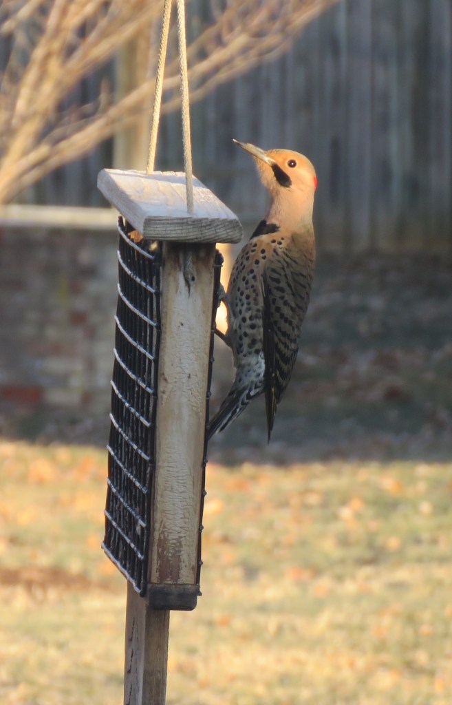 On one recent afternoon, a striking male Northern Flicker was the lone bird at the suet feeder. First, however, it approached carefully. Male flickers have a prominent black mustache on both sides of their bills. It landed on a limb near the feeder and sat perched before it shimmied down the shady side of the tree trunk.