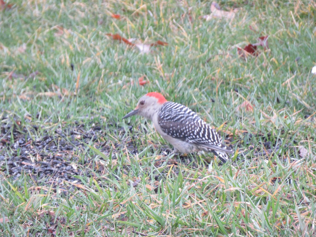 However, I am happy with the variety of woodpeckers that have made a regular appearance at our feeders. They have especially frequented the peanut butter suet feeder in the front yard. The feeder hangs from the large red maple, only 30 feet from the street. Others prefer the black oil sunflower seeds, while some peck at the cracked corn I spread on the ground.