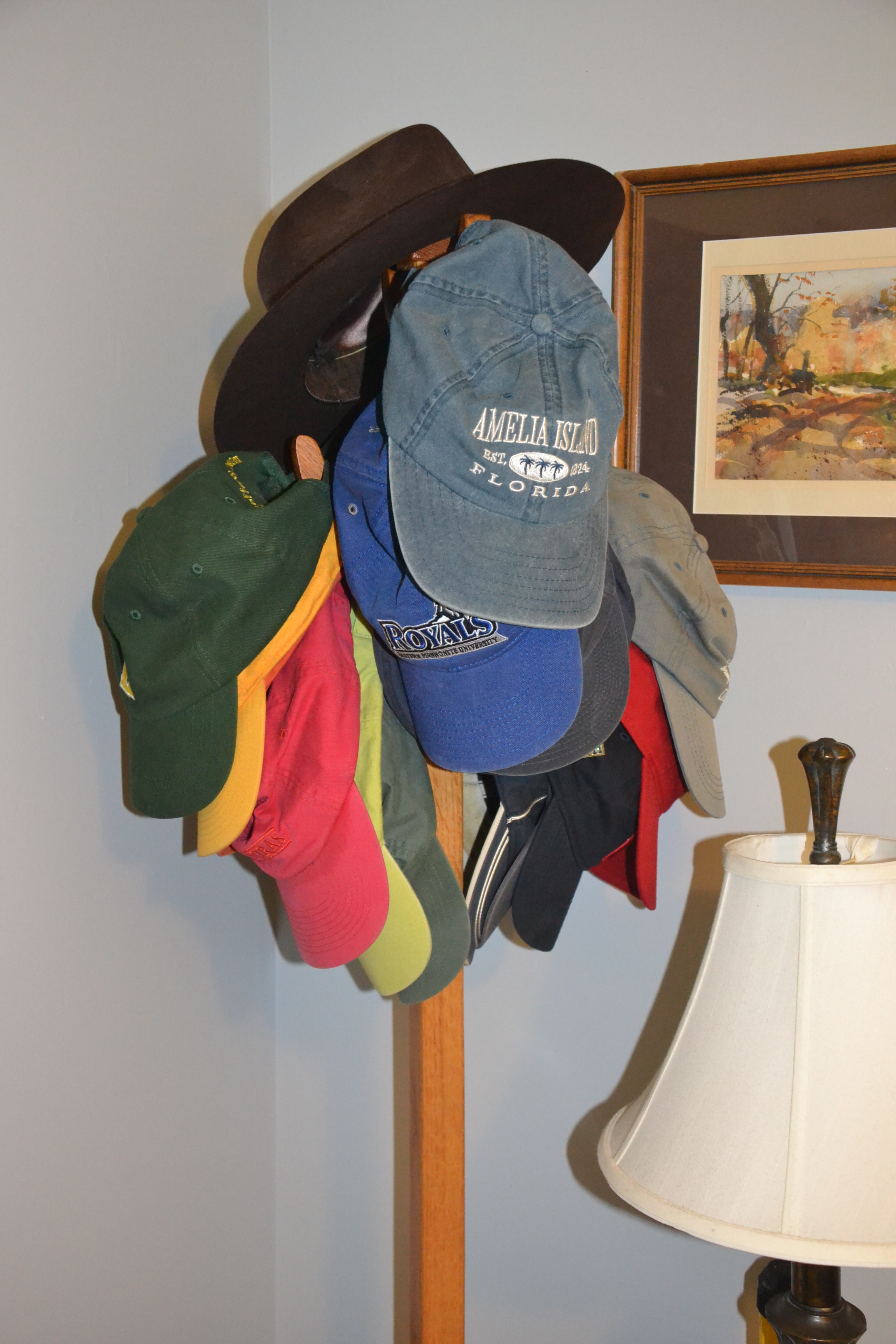 The brown, broad-brimmed, pressed velvet Stetson cowboy hat occupies the pinnacle of the hat holder. That’s no coincidence. My daughter and her family gave it to me as a present several years ago when they lived in Texas. I wear it only on rare occasions.