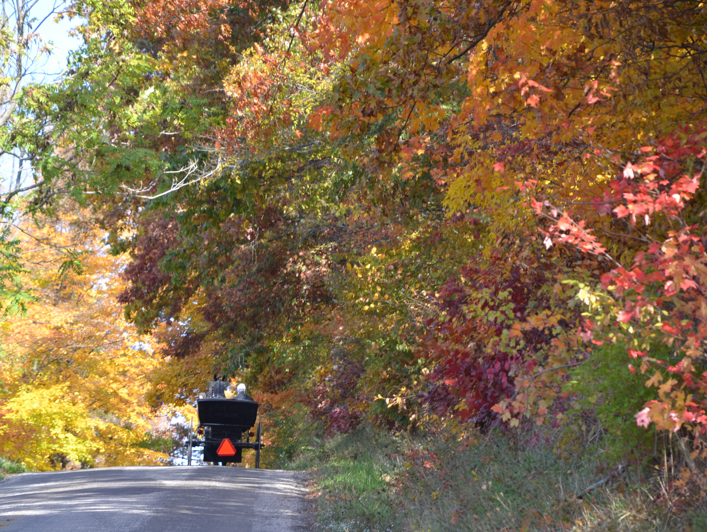 An Amish buggy crests a hill amid a rainbow of colors in Holmes Co., Ohio.